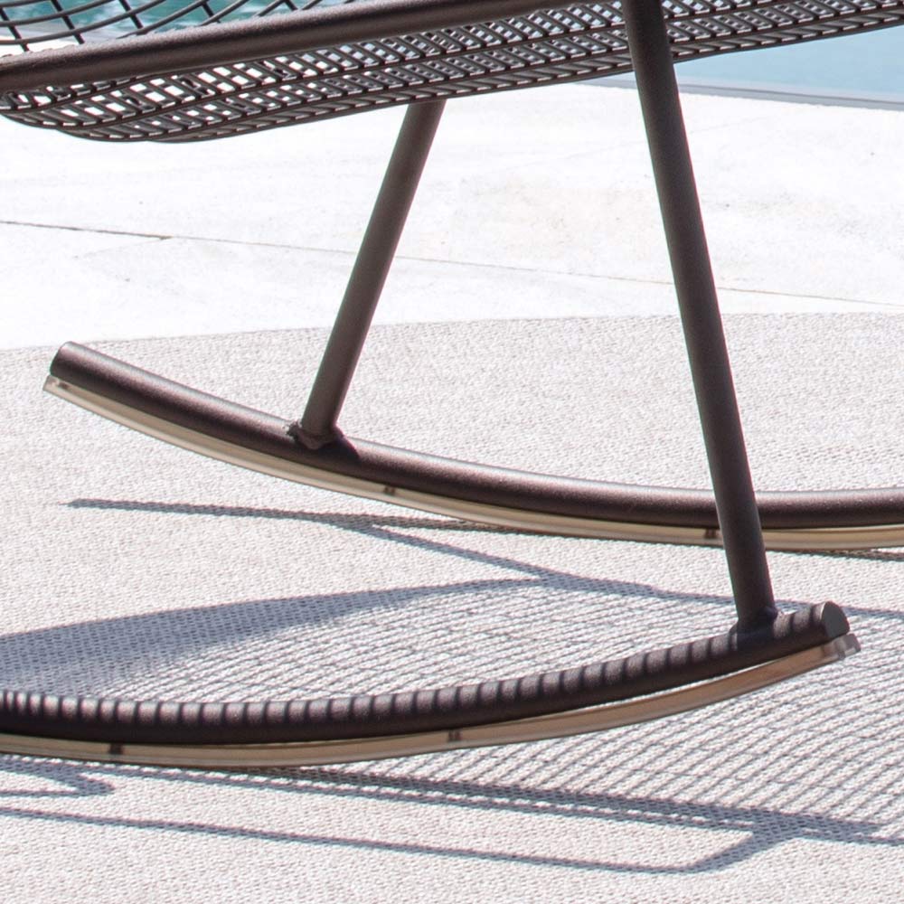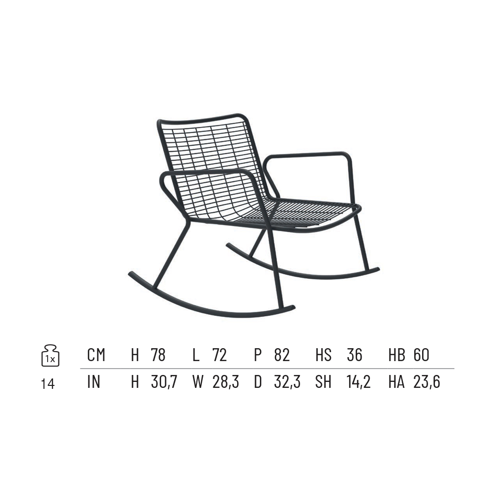 Outdoor rocking chaise longue entirely made in Italy with a powder-coated galvanized iron structure complete with armrests . A practical and modern seat whose aesthetics are marked by a pop accent balanced by the sober and delicate nuances available. Simple, functional and beautiful, it is characterized by harmonious proportions and a wide and comfortable seat , thus offering optimal comfort while contributing to furnishing any outdoor space, both domestic and contract, through a touch of elegant and refined style .