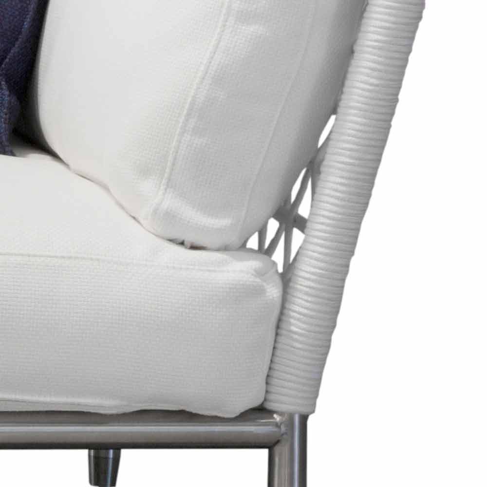 The seat and back are woven in PVC / acrylic cord and enriched with soft cushions with dryfeel padding and removable cover in outdoor fabric. The shatterproof feet are made of white Teflon.