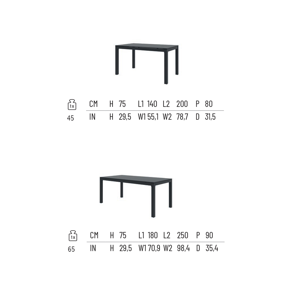 - L 180/250 x D 90 x H 75 cm (1 extension of 70 cm).