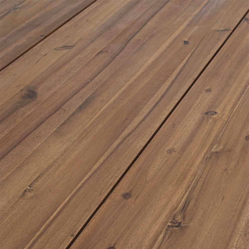 Top in acacia wood fsc 100%. oil finish, hot-dip galvanized and powder-coated (polyester) steel legs. Side slats in original trunk sections. Galvanized steel screws. Legs to assemble.