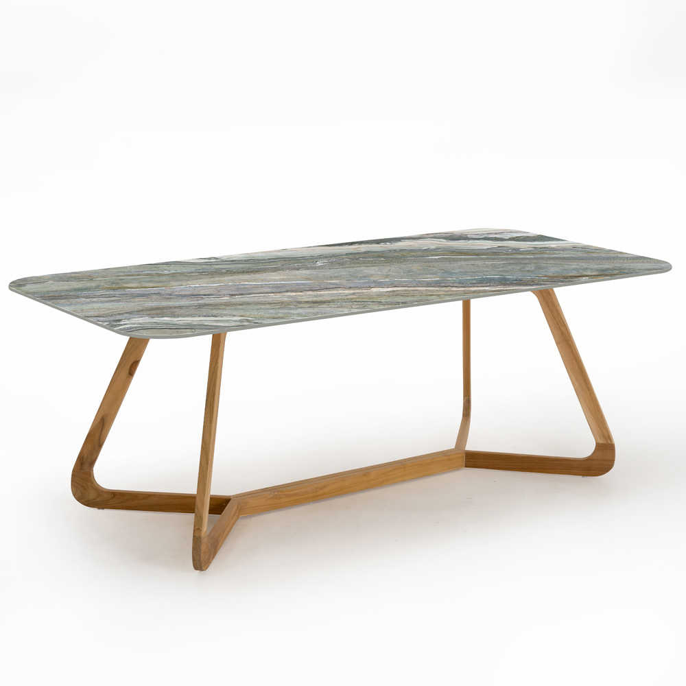 Outdoor table made with a solid natural teak wood base (35 mm thick), infinity stoneware ceramic top (12 mm thick) with a glossy Royal Peacock finish and a subframe in Okumé marine plywood , entirely Made in Italy.