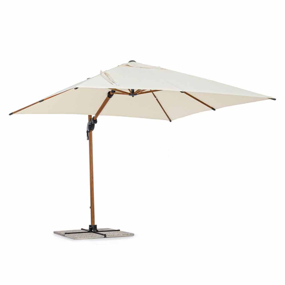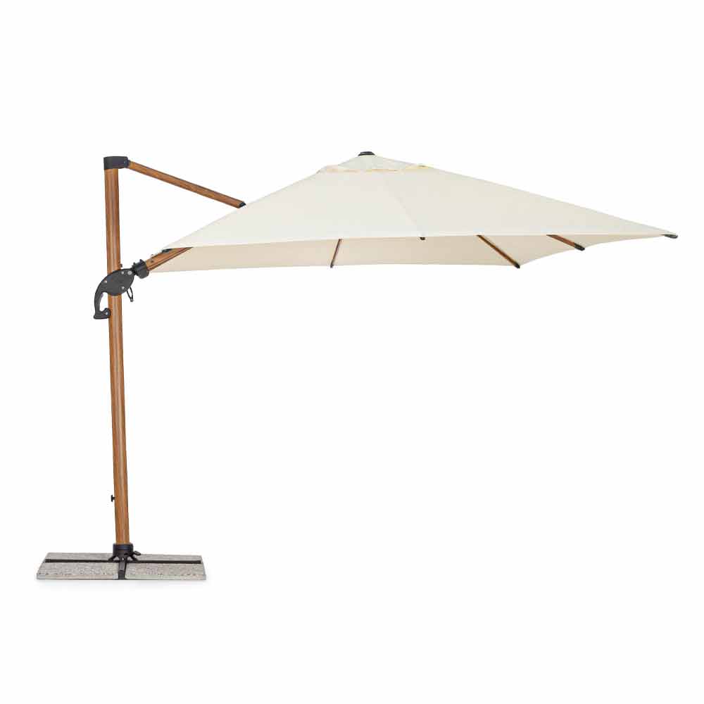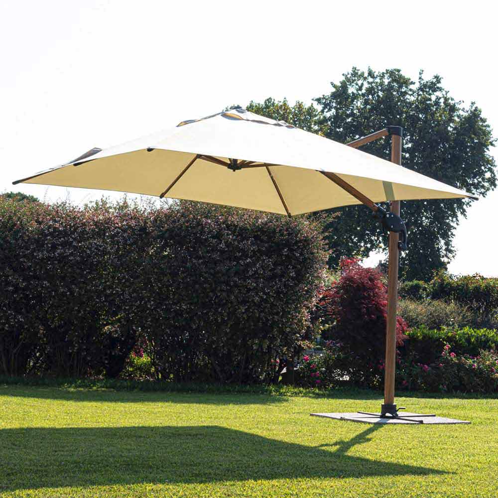 Powder coated aluminum structure (polyester) with wood effect. 90x60mm pole, 8 25x17mm ribs. Beige polyester fabric 250gr / m2 with pa (polyamide) coating. Cross base in steel . 360 ° rotating pole with pedal. Vertical tilt with 6-position handle. Equipped with right-left tilting system for umbrella. Including umbrella cover.