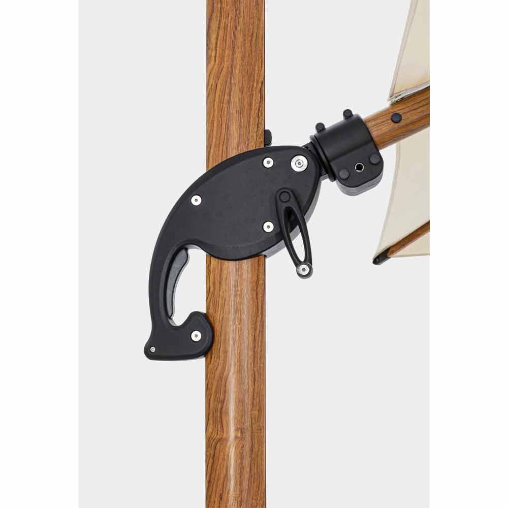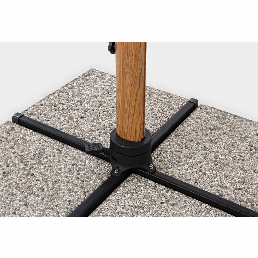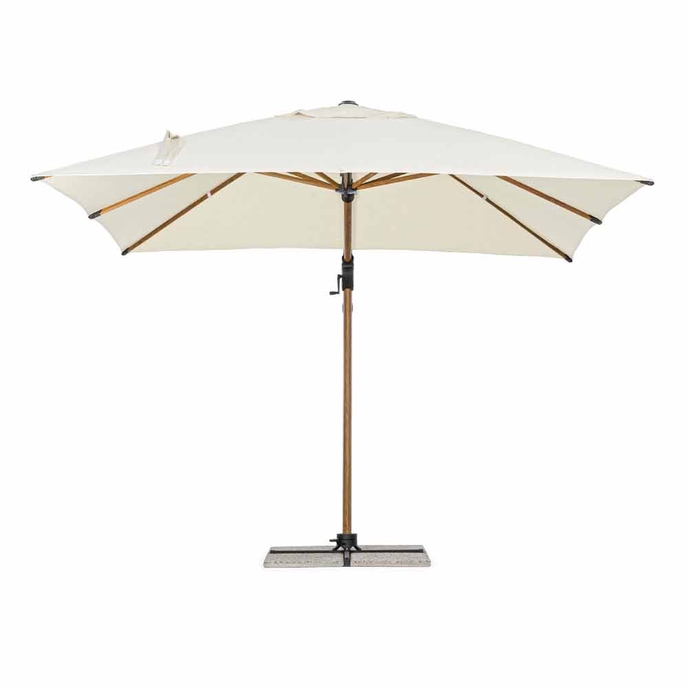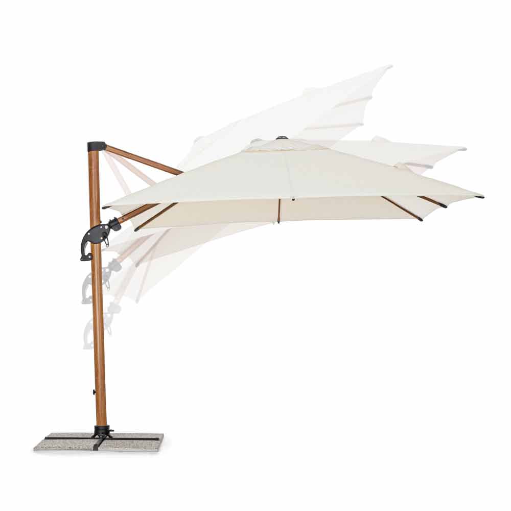 Powder coated aluminum structure (polyester) with wood effect. 90x60mm pole, 8 25x17mm ribs. Beige polyester fabric 250gr / m2 with pa (polyamide) coating. Cross base in steel . 360 ° rotating pole with pedal. Vertical tilt with 6-position handle. Equipped with right-left tilting system for umbrella. Including umbrella cover.