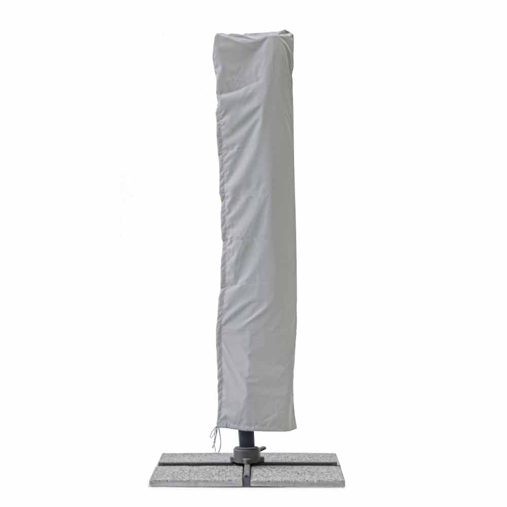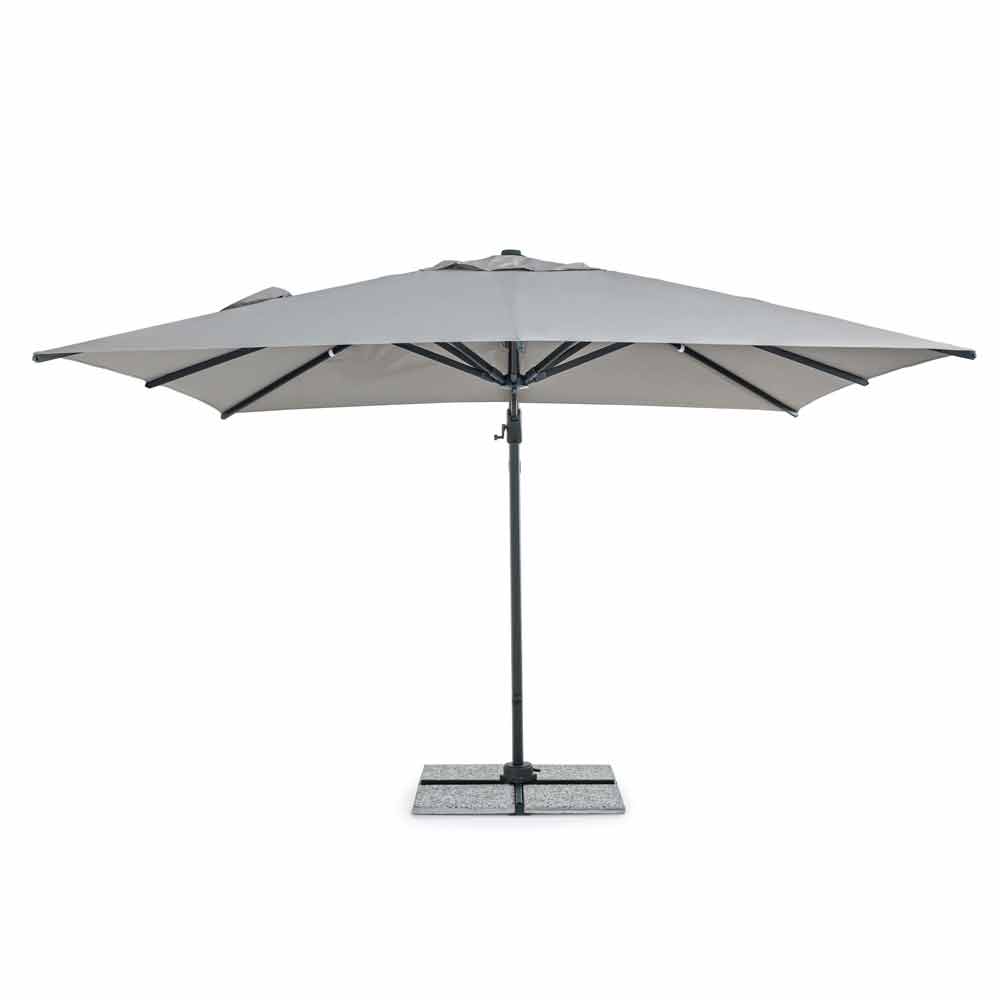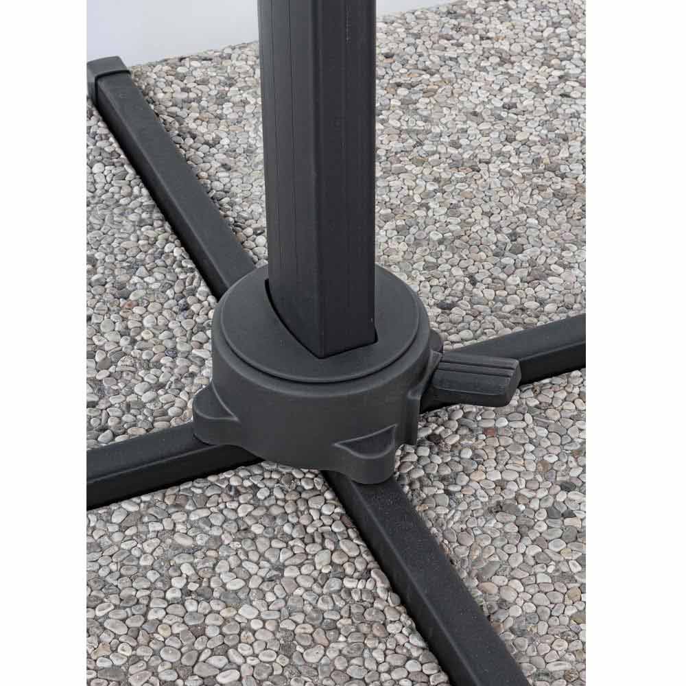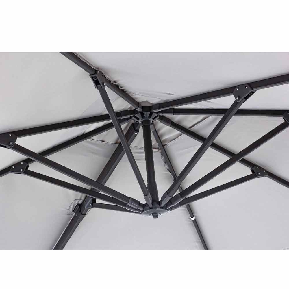 Powder coated aluminum structure (polyester). 93x57mm pole. 8 ribs 28x18mm. Light gray polyester fabric 250gr / m2 with pa (polyamide) coating. Cross base in steel . 360 ° rotating pole with pedal. Vertical inclination with 5-position handle. Including umbrella cover.