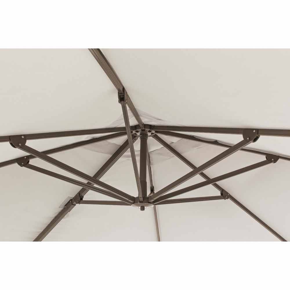 Powder coated aluminum structure (polyester). 53x77mm pole, 25x40mm suspended pole, 8 14x24mm ribs. Natural polyester fabric 200gr / m2 with pa (polyamide) coating. Cross base in steel . Manually rotatable 360 ° pole.