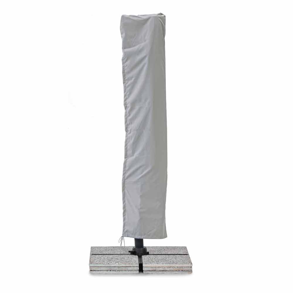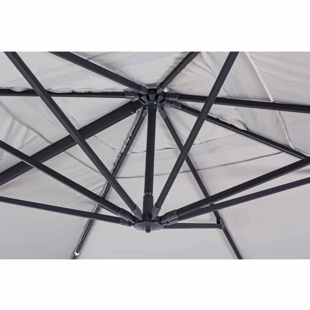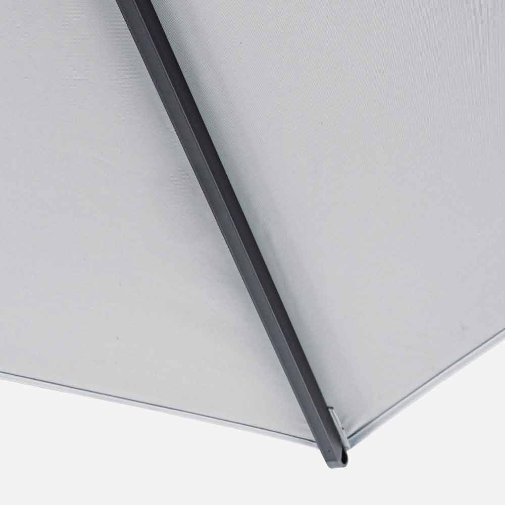 Powder coated aluminum structure (polyester). 93x57mm pole. 8 ribs 28x18mm. Light gray polyester fabric 250gr / m2 with pa (polyamide) coating. Cross base in steel . 360 ° rotating pole with pedal. Vertical inclination with 5-position handle. Including umbrella cover.