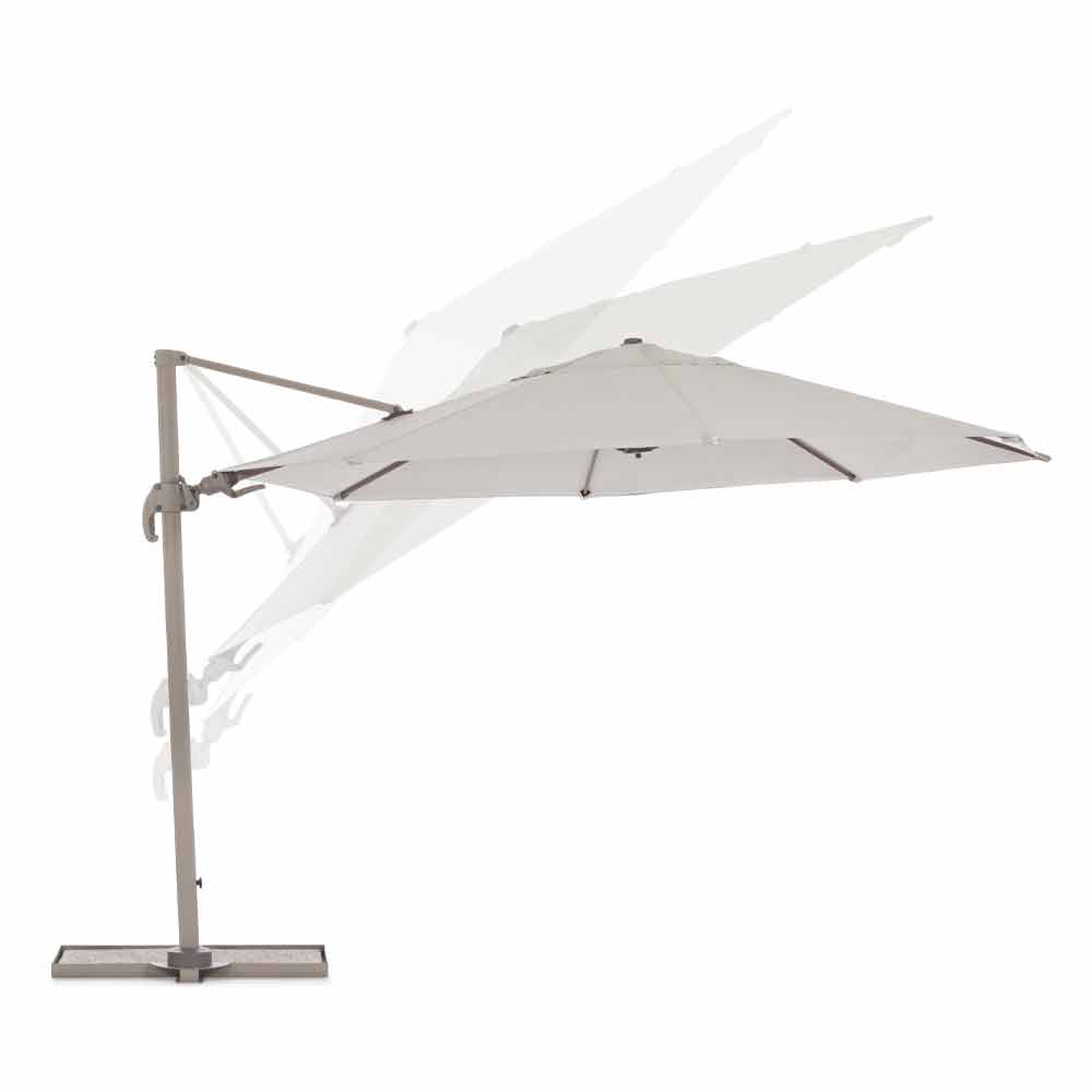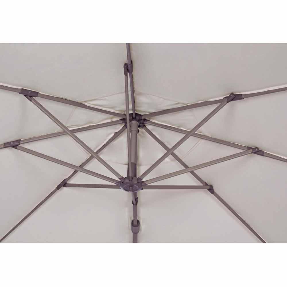 Powder coated aluminum structure (polyester). Pole 50x78x1.6mm. 8 ribs 12x23x1.0mm. Sand-colored polyester fabric 200gr / m2 with pa (polyamide) coating. Side base in steel . 360 ° rotating pole with pedal. Vertical inclination with 5-position handle. Equipped with handle for right-left tilting of the umbrella.