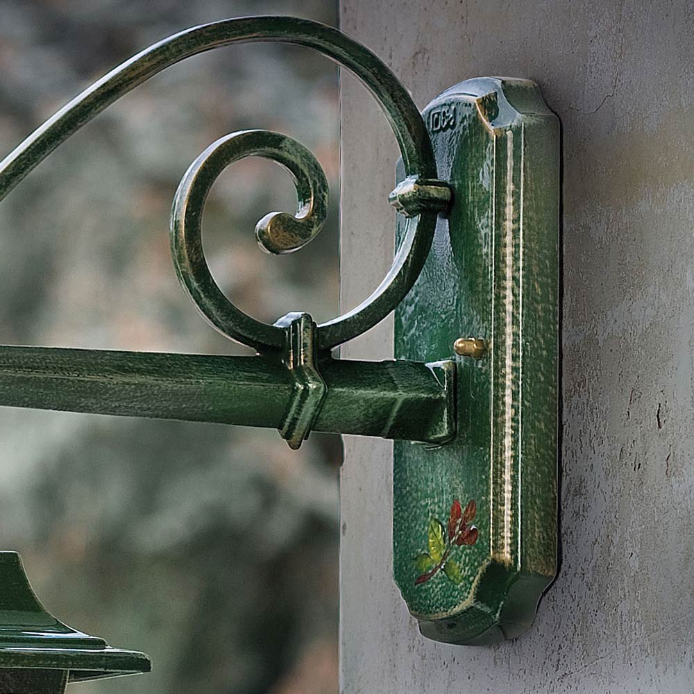 This outdoor wall lamp is entirely made of green aluminum with a gold shade decorated with hand-painted flowers for a classic and harmonious style between shape and colors.