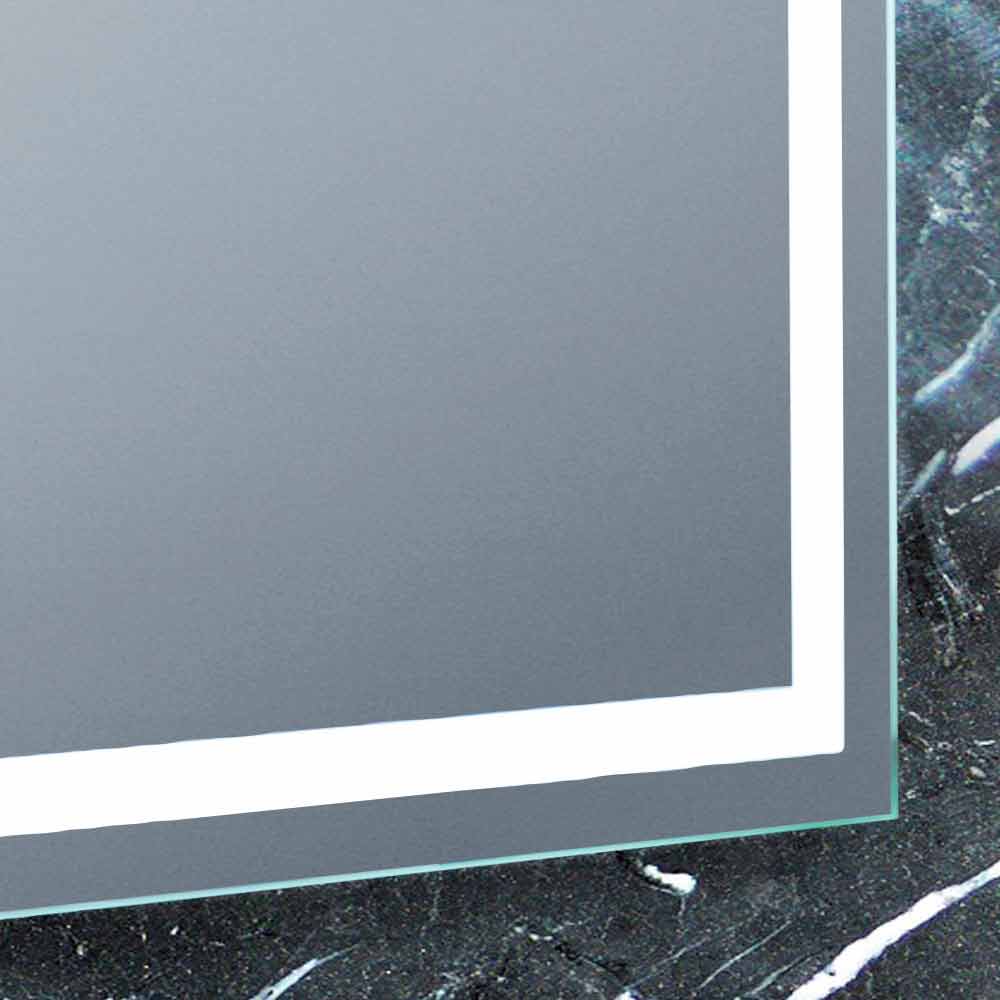 Bathroom mirror with integrated LED lighting and stainless steel edges.