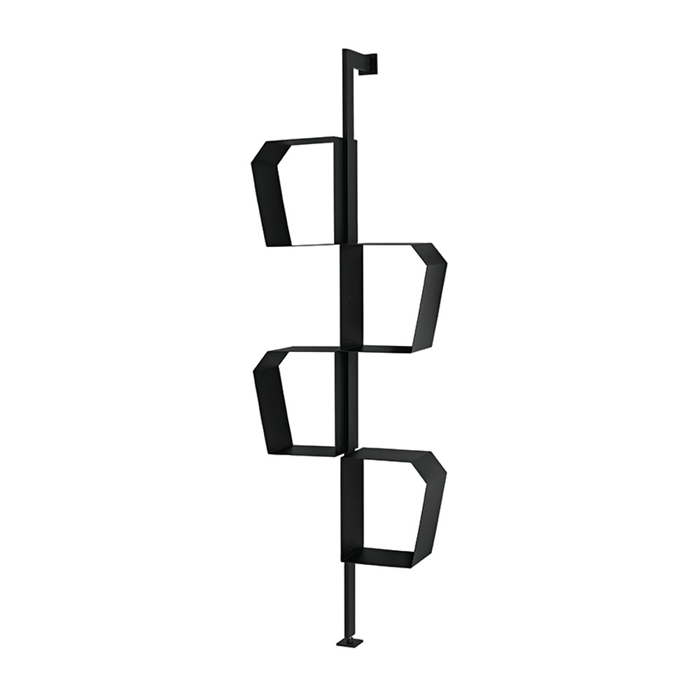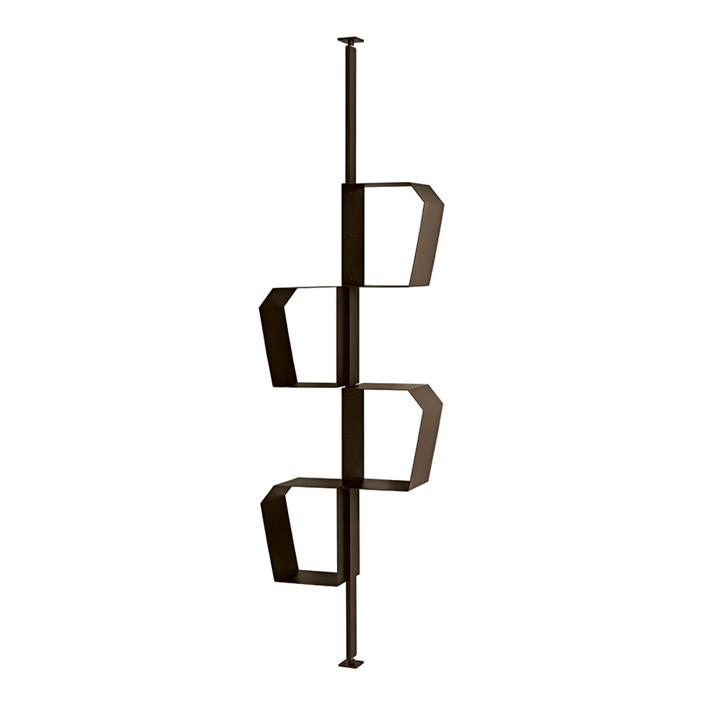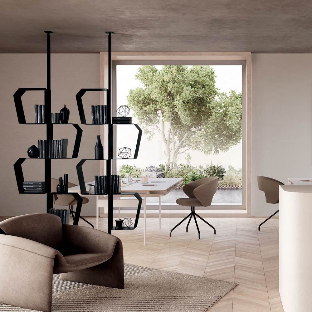 Thanks to its versatile configuration, the bookcase can be installed with wall or ceiling fixings . In the ceiling version, it can also be used as a dividing element , perfect for separating spaces while maintaining visual lightness.