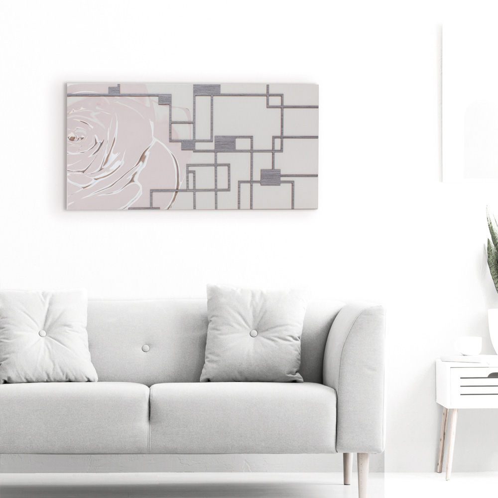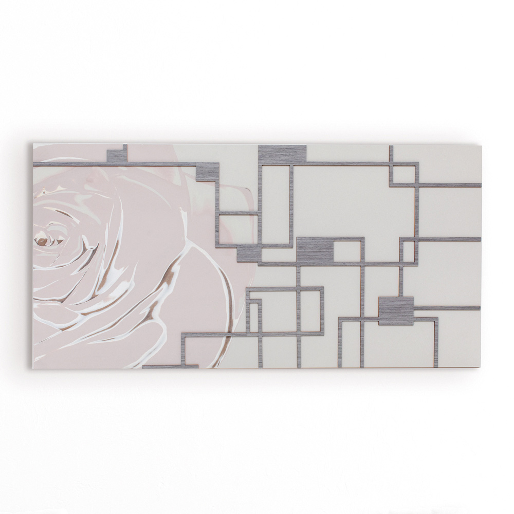 The decorative panel is made using the laser marking technique which creates a bas-relief on the material, creating different color gradations of the petals created on the panel. The framework is made of sand lacquered wood with gray applications. Soft shades of pink play with the geometric decor in gray wood.