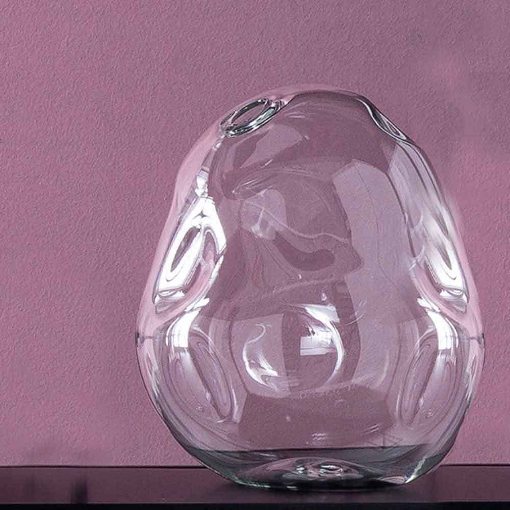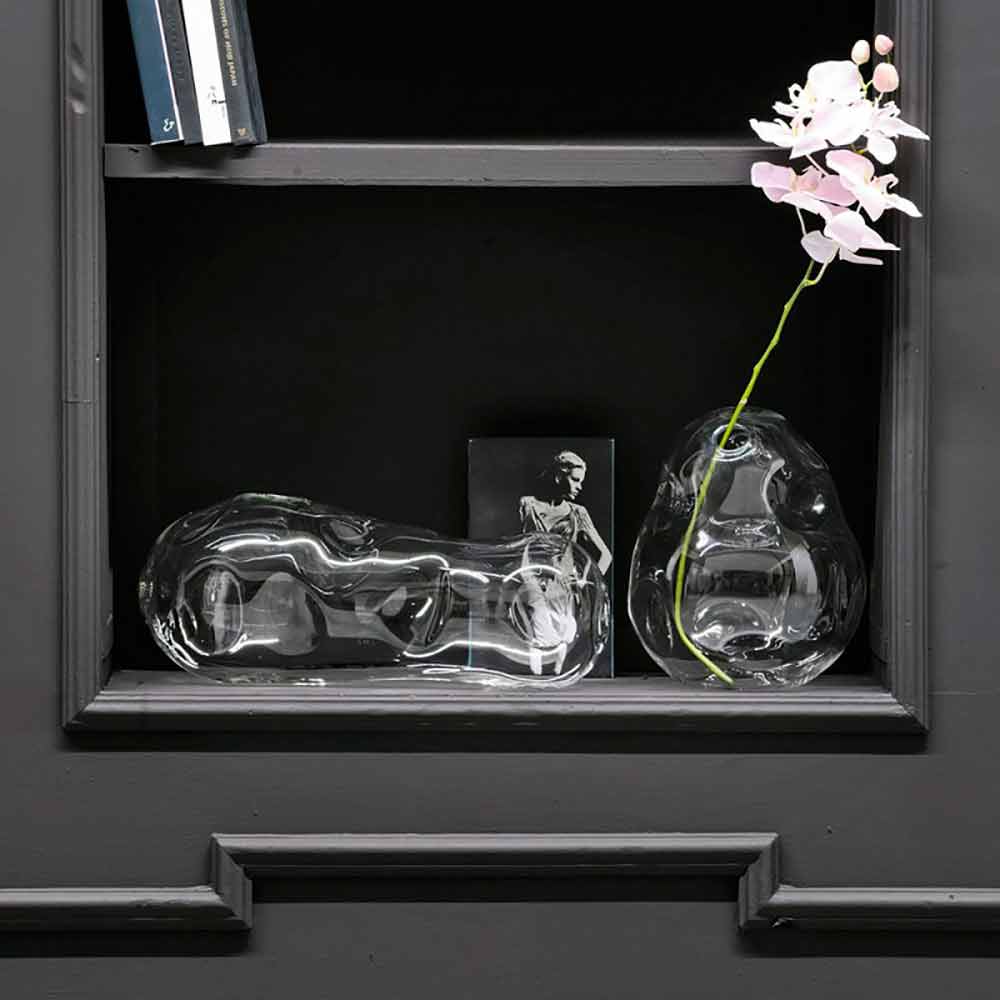 Original pair of decorative vases made in Italy in transparent blown glass with an eccentric design. Originality, creativity and elegance are the peculiar characteristics of this composition of modern vases which come together to give life to an extremely unusual and imaginative furnishing solution . The passion and experience of the masters of blown glass allow to create a real work of art and to increase its value even more is the fact that each piece is unique and unrepeatable as it is marked by small differences that underline it. the value. The result will therefore be a design complement capable of winning every attention thanks to its exclusive personality and its original character .