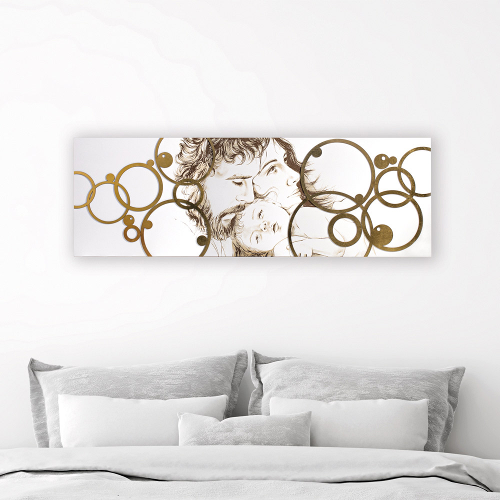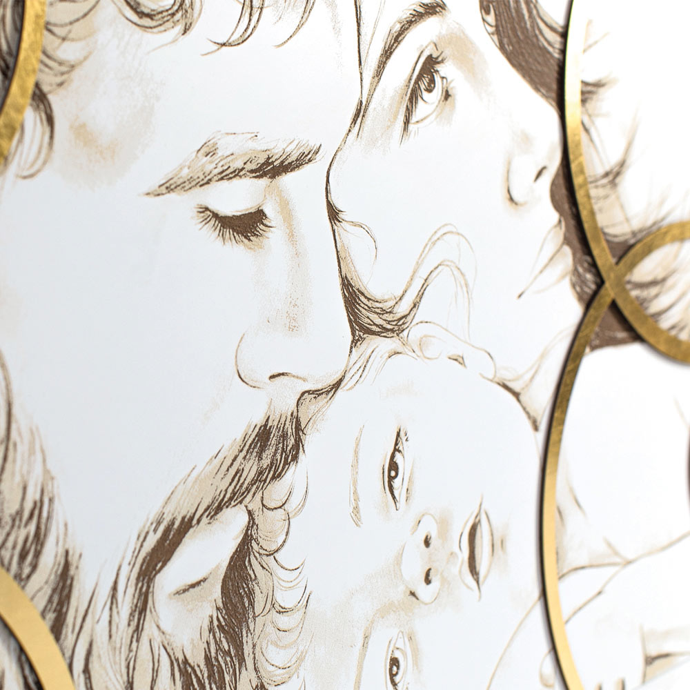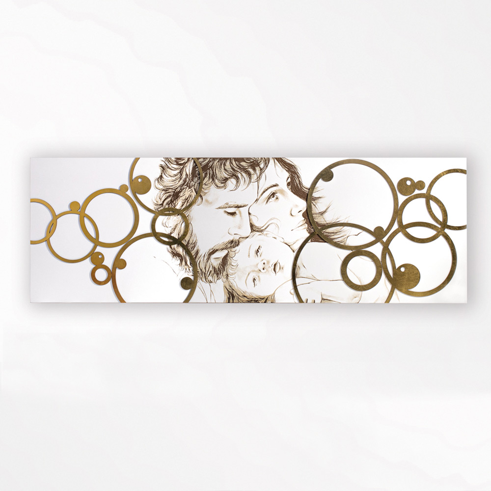 The panel Ā represents the Holy Family in a modern style . Gold leaf decorations are applied to the laser marked design. Matt white lacquered wooden panel with laser marking, a special technique that creates a bas-relief on the materials. The applications are made in gold leaf , a special precious technique.