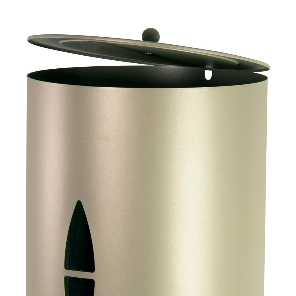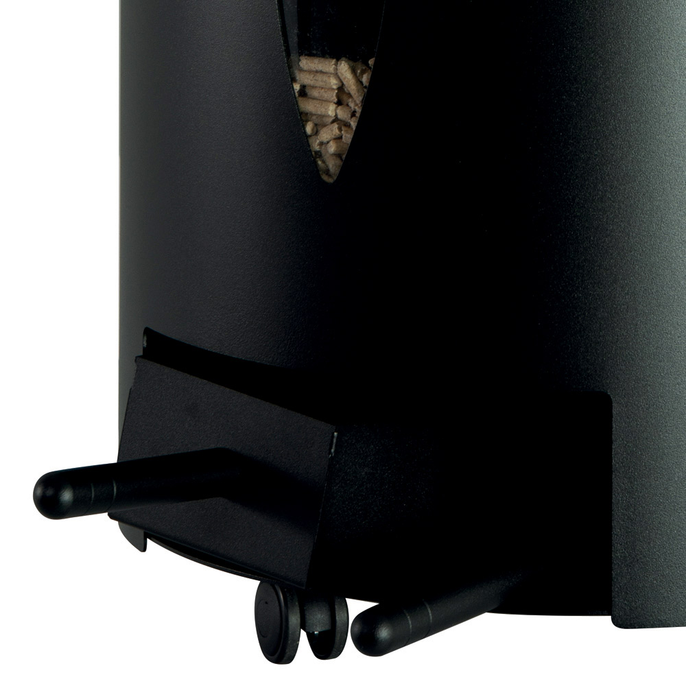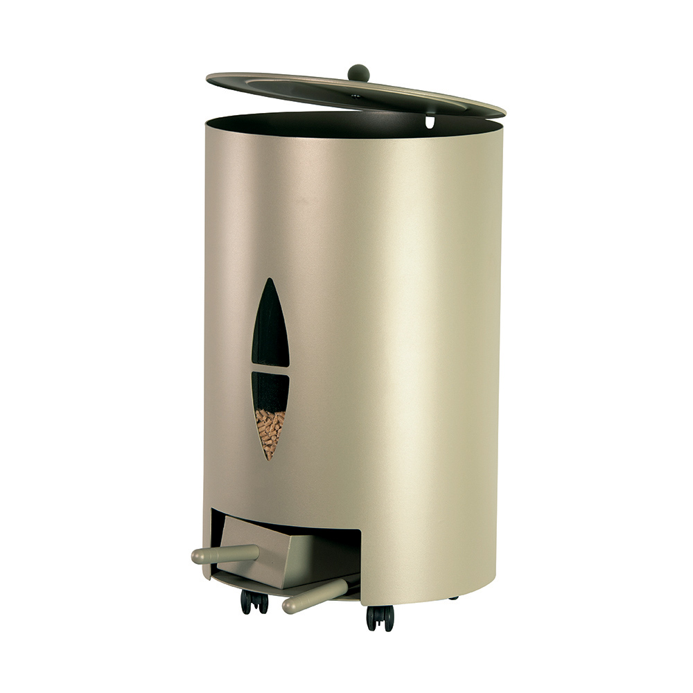 This fireplace pellet holder stands out for its cylindrical and modern design , easily adapts to any home environment. The solid metal structure ensures strength and longevity, while the integrated wheels ensure easy movement. The container is equipped with a top lid , which protects the pellets from humidity and dust, keeping it dry and ready for use. Furthermore, the front window not only adds an aesthetic touch but allows you to monitor the pellet level without having to open the container. This pellet holder is the ideal solution for those looking for practicality, cleanliness and style in home heating.