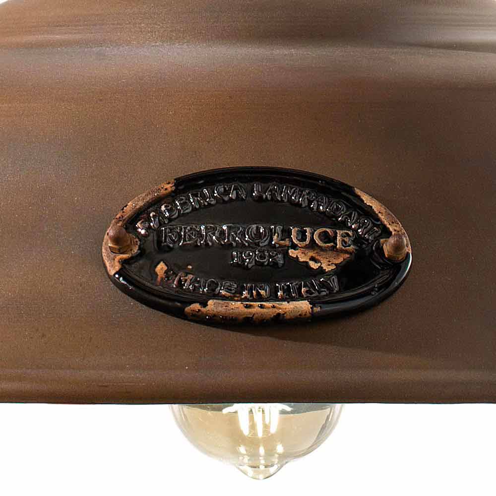 This beautiful lamp consists of a large diffuser made of antiqued metal, specifically in iron in the corten - rust finish.