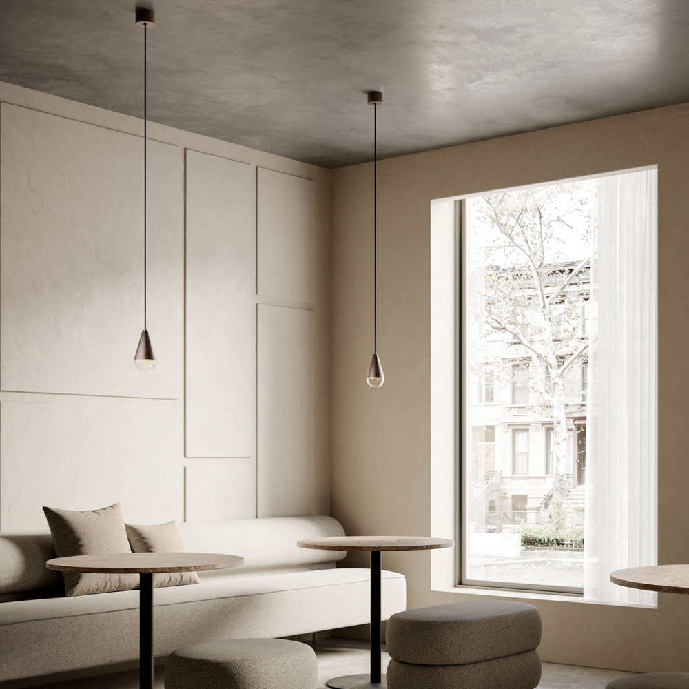 Made in Italy. The clean lines of the collection of indoor lamps highlight the purity of the iron material. The pendant element can be used alone or in combination with others, to create linear compositions or groupings with a scenographic effect.