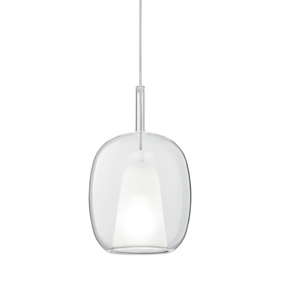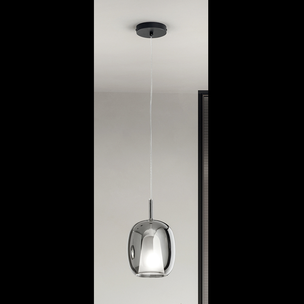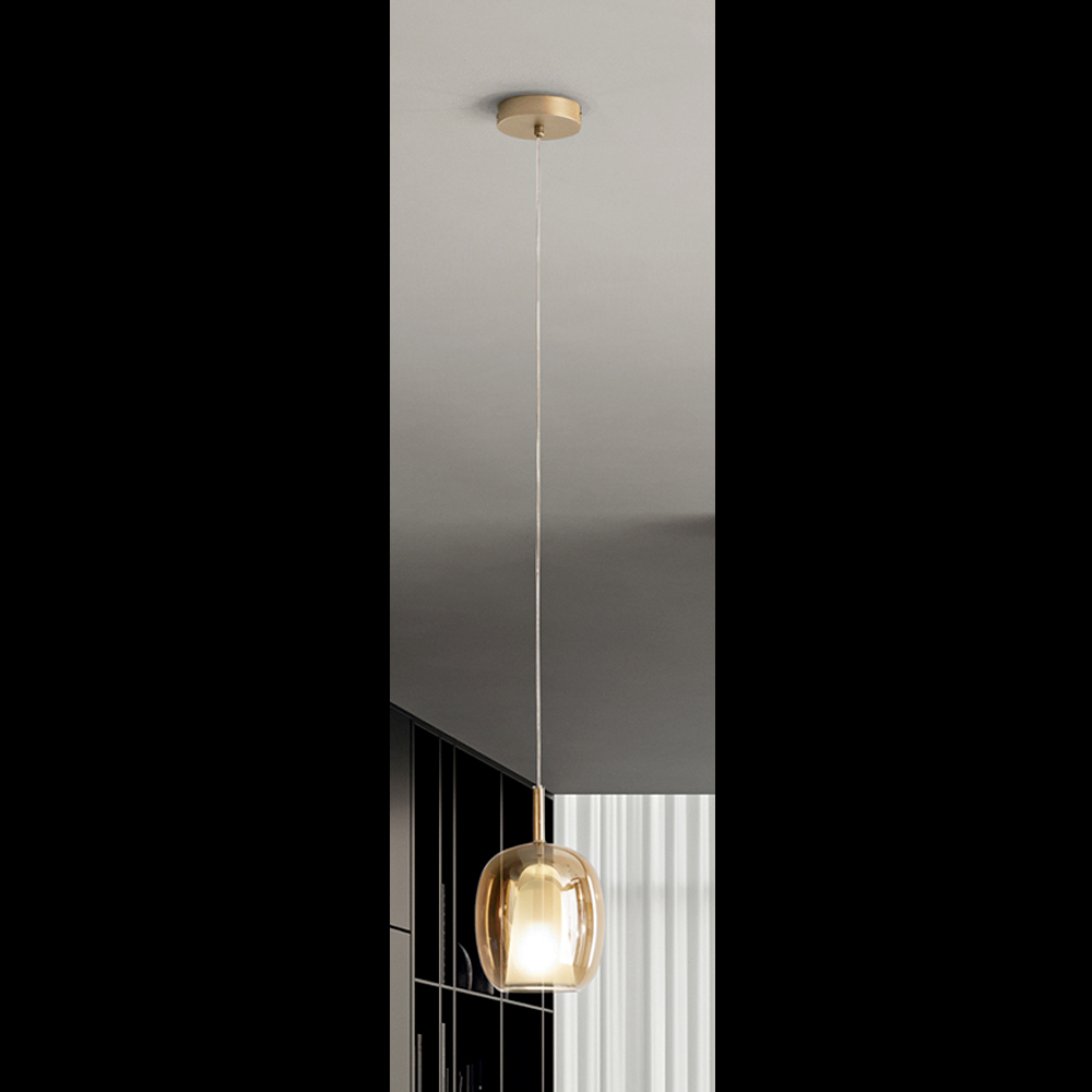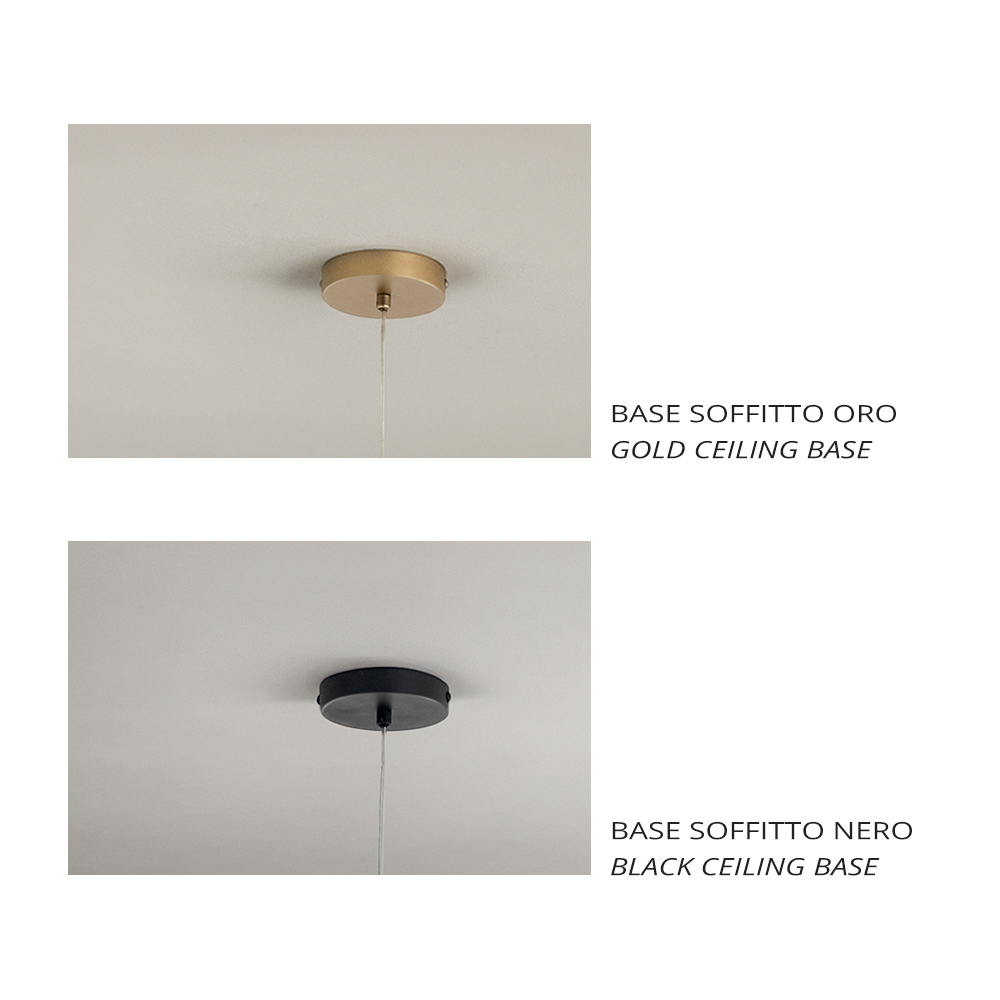 Lamp made with a metal ceiling base and blown glass diffuser, characterized by a double layer: internal in satin glass and external in colored glass . Cap in polymeric material to stabilize the cable in a central position. Adjustable cable.