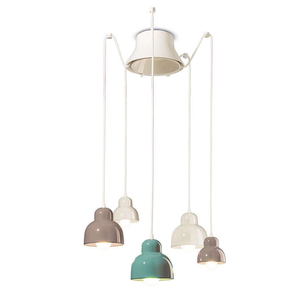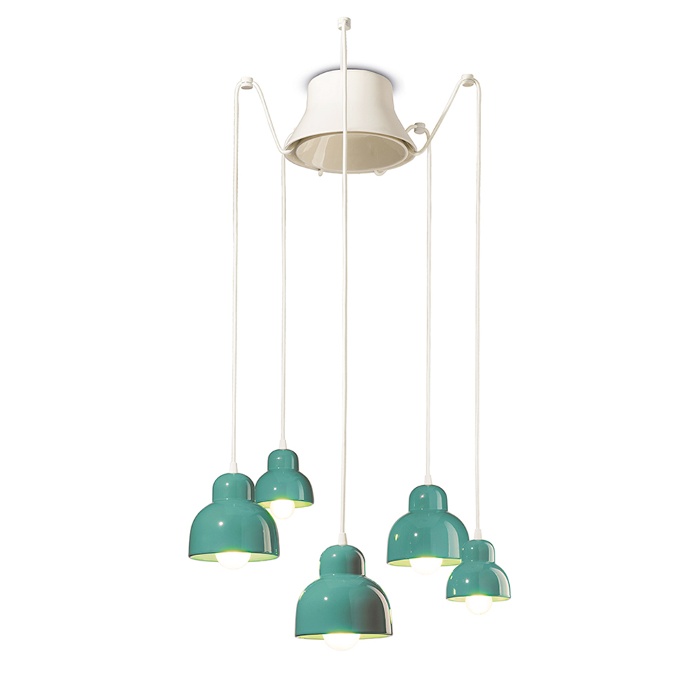 Pendant lamp with 5 elements made of colored ceramic , entirely Made in Italy.