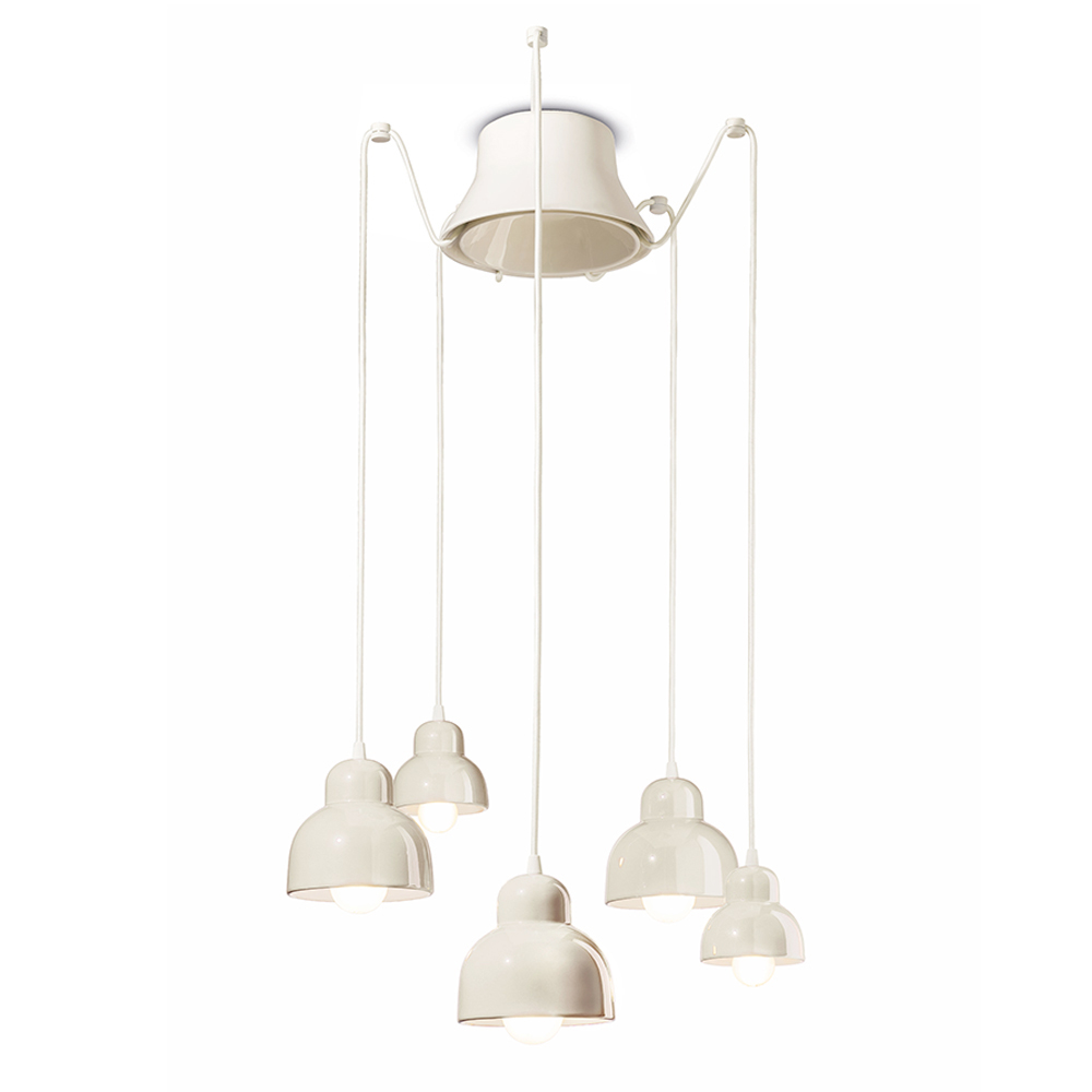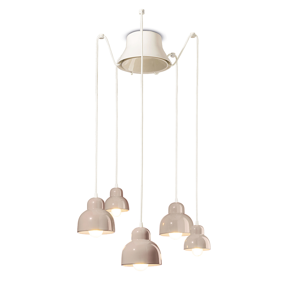 This ceramic pendant lamp is a charming example of contemporary design inspired by tradition . Its five pendant lights radiate at different heights, like a visual dance of shapes and lights in space.