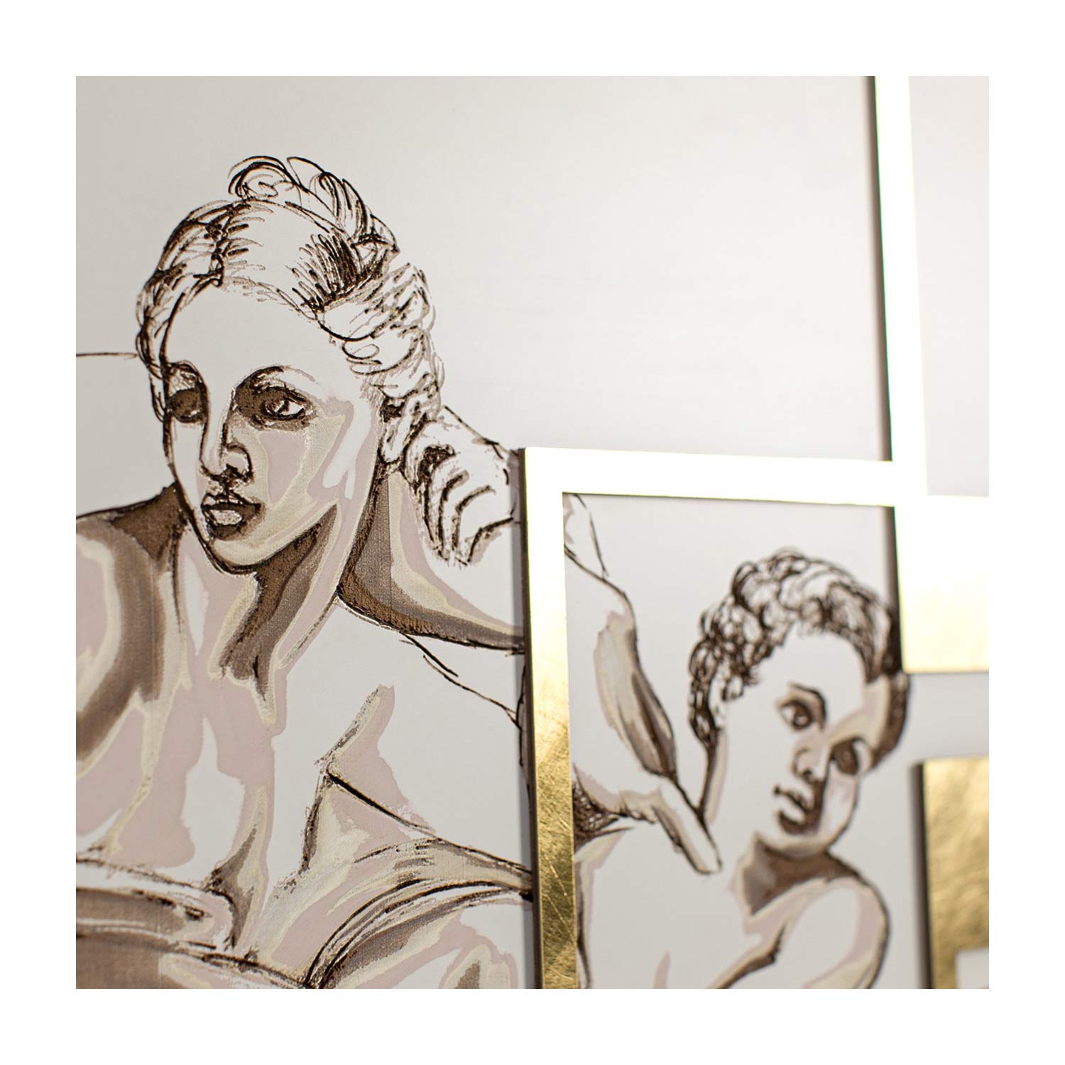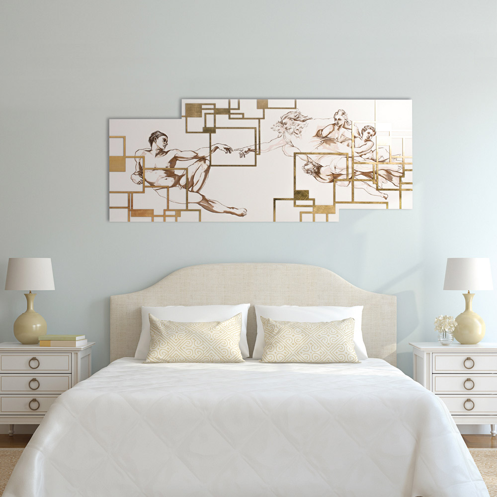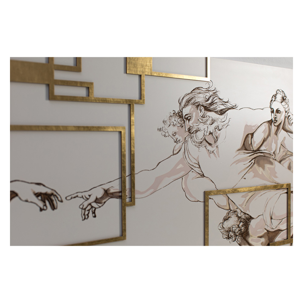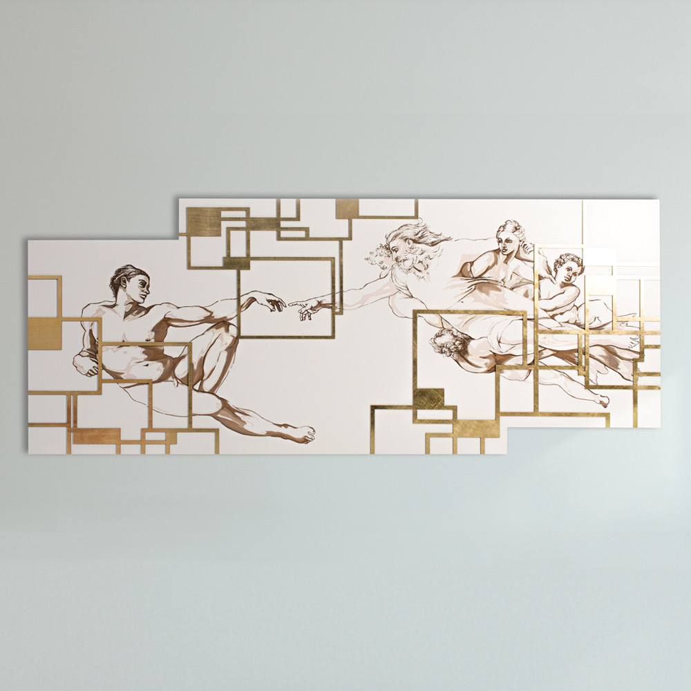 The panel is a unique headboard depicting the centerpiece of Michelangelo 's fresco in the Sistine Chapel, "The Creation of Adam" . The fresco is skilfully reported in the smallest details thanks to the laser marking which creates nuances of color and depth . Framework in matt white lacquered wood with laser marking, a special technique that creates a bas-relief on the materials.
