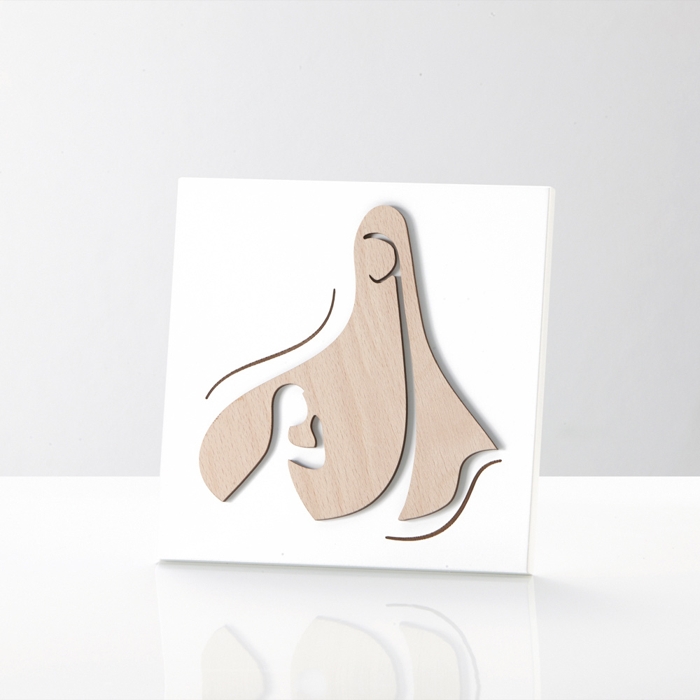 Sacred picture depicting the apparition of the Madonna in natural wood and laser engraving. White lacquered wooden panel with support foot and hole to hang it on the wall..