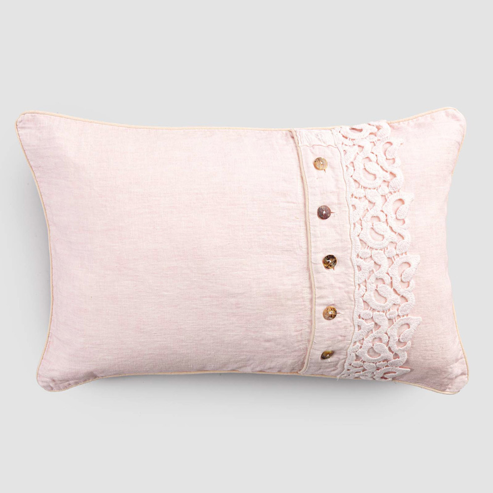 The value of tradition joins the modern lifestyle with this linen pillow case embellished with poem lace , Agoya mother-of-pearl buttons and piping piping .