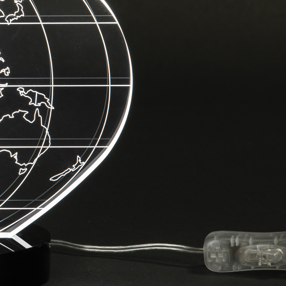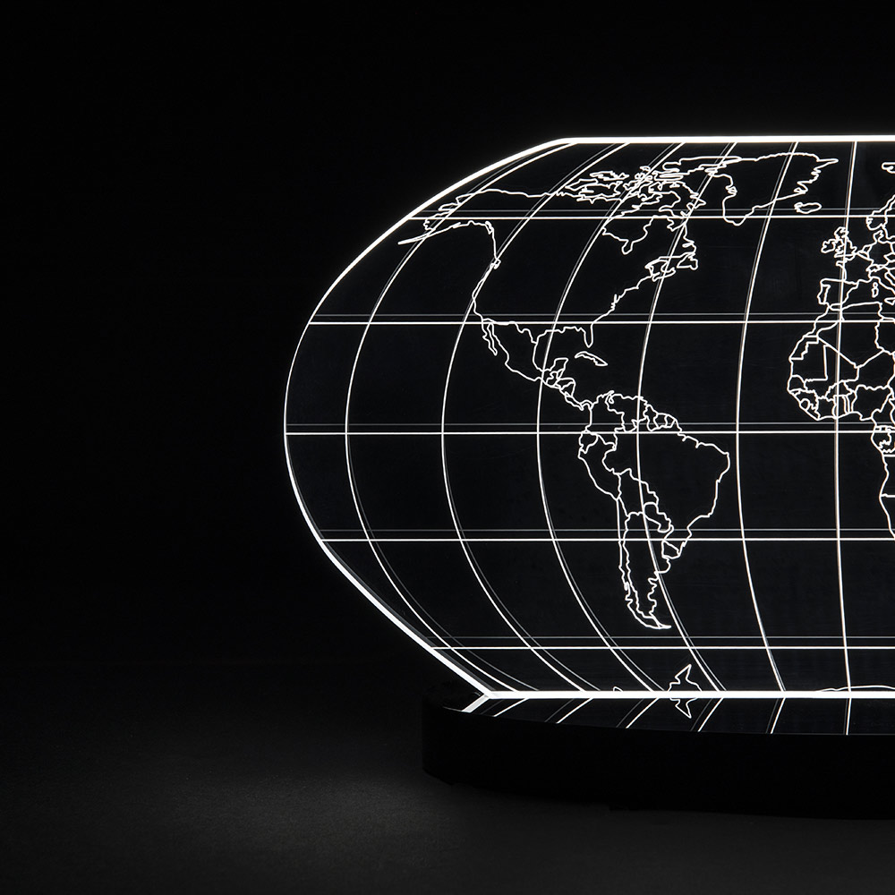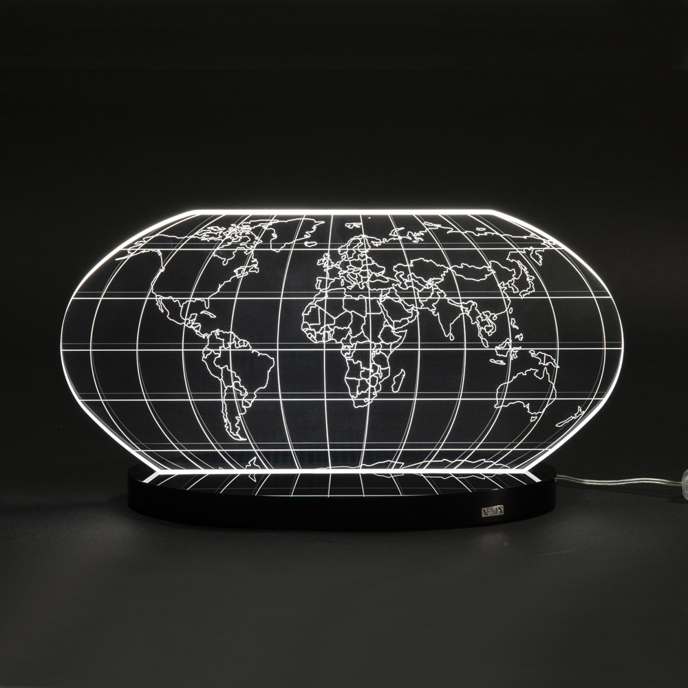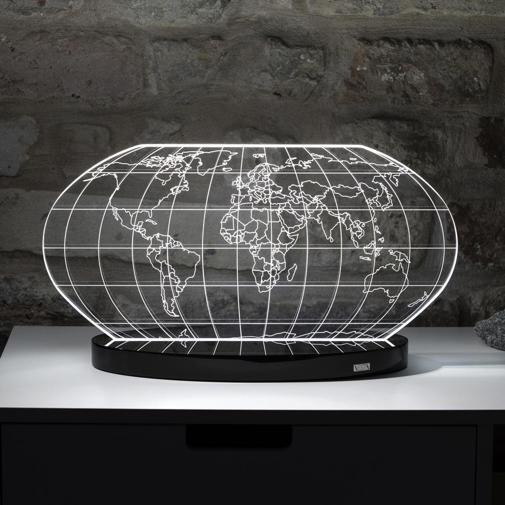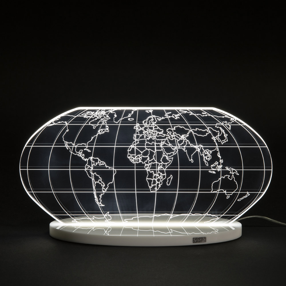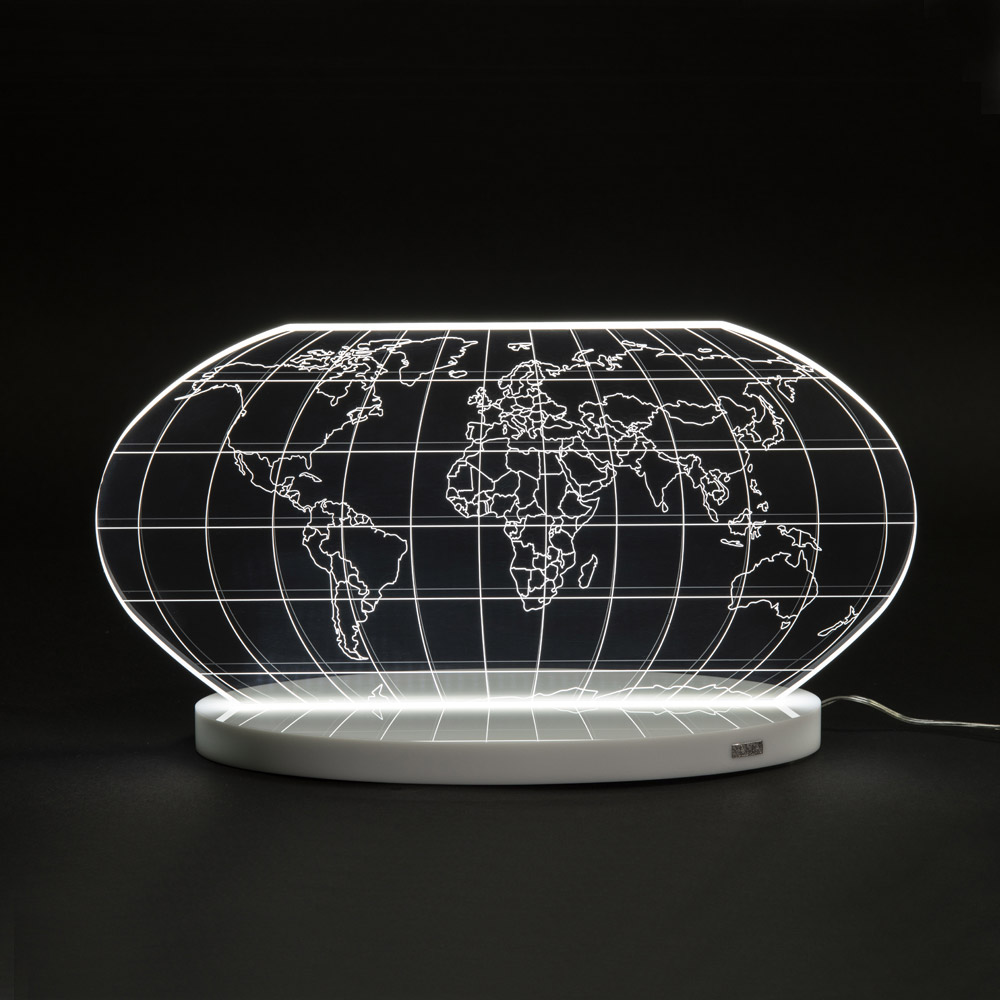 Table lamp in transparent acrylic crystal and laser engraved world map, 2 sizes made in Italy.