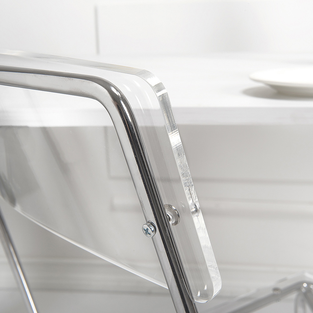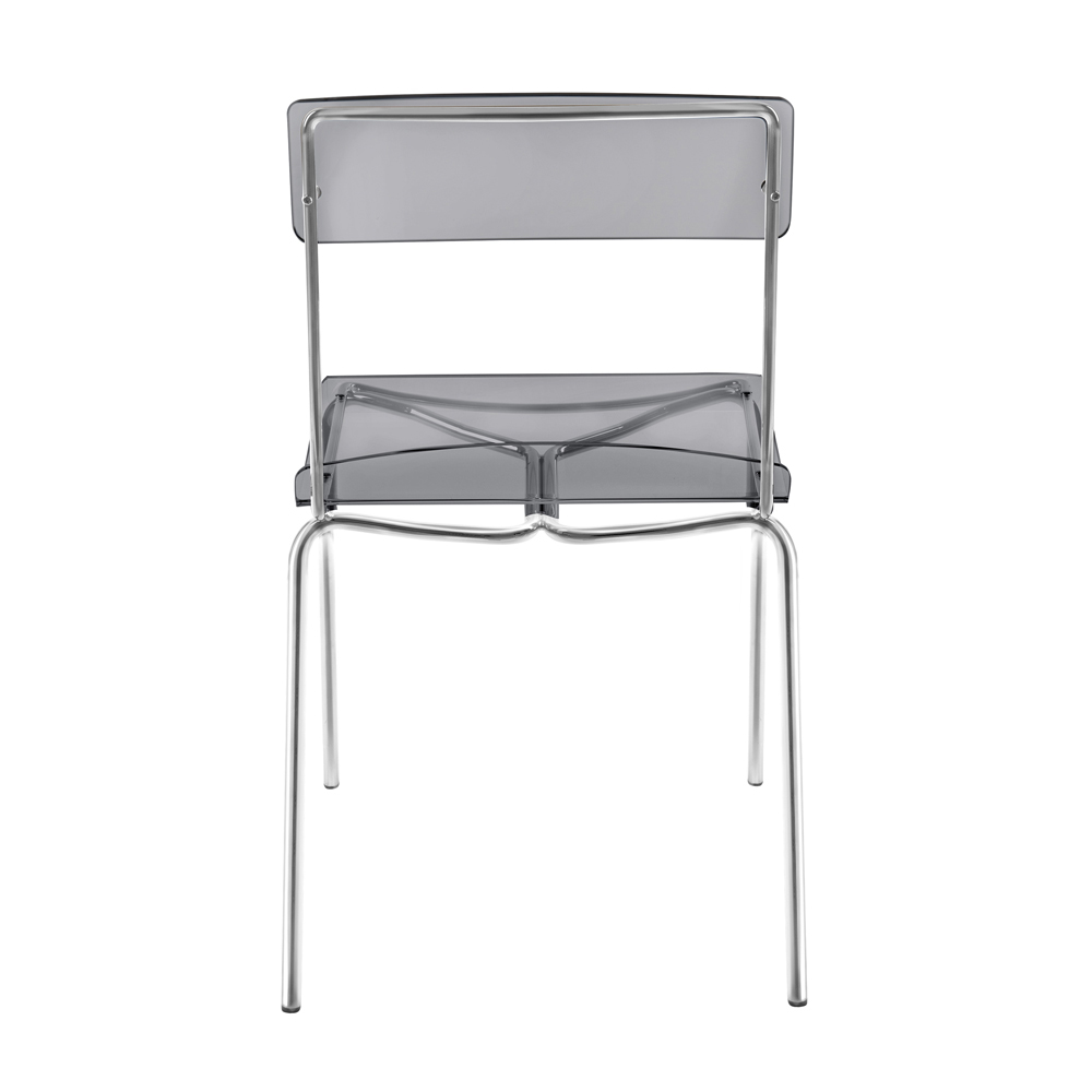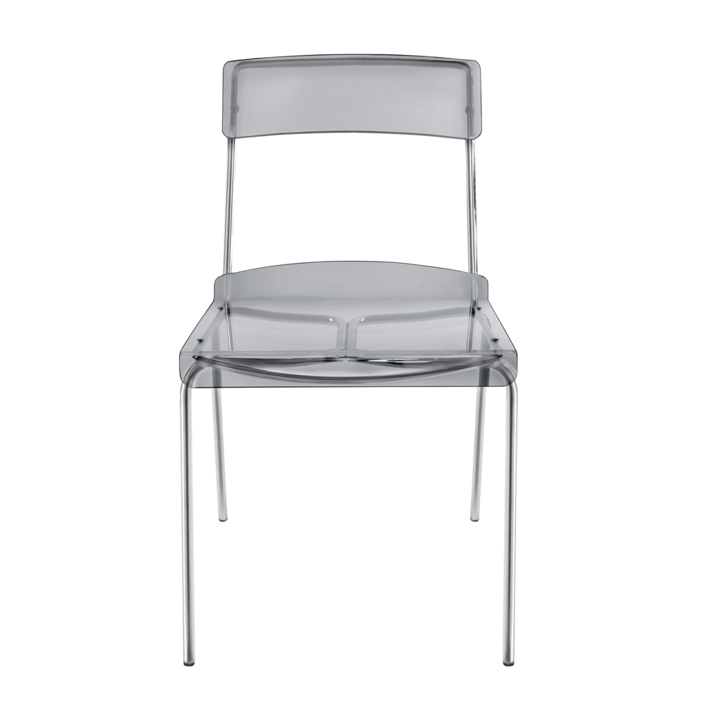 Dining room chair with plexiglass shell and silver chromed metal structure, entirely made in Italy . An ideal furnishing solution for those looking for simplicity and versatility of use to be able to furnish their domestic spaces with a modern character and high functionality . The shape of the structure also makes it possible to stack them, thus making it a perfect idea also for contract spaces such as bars and restaurants.