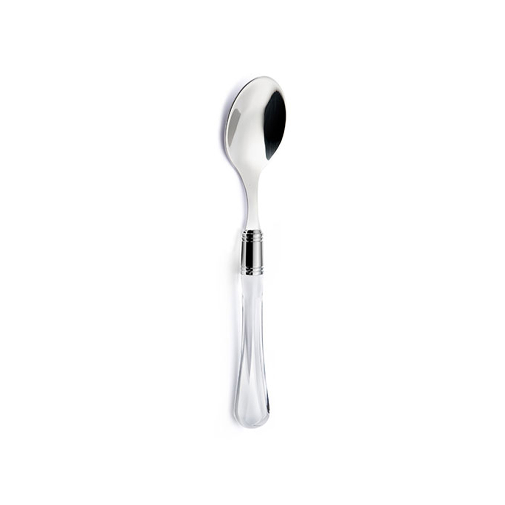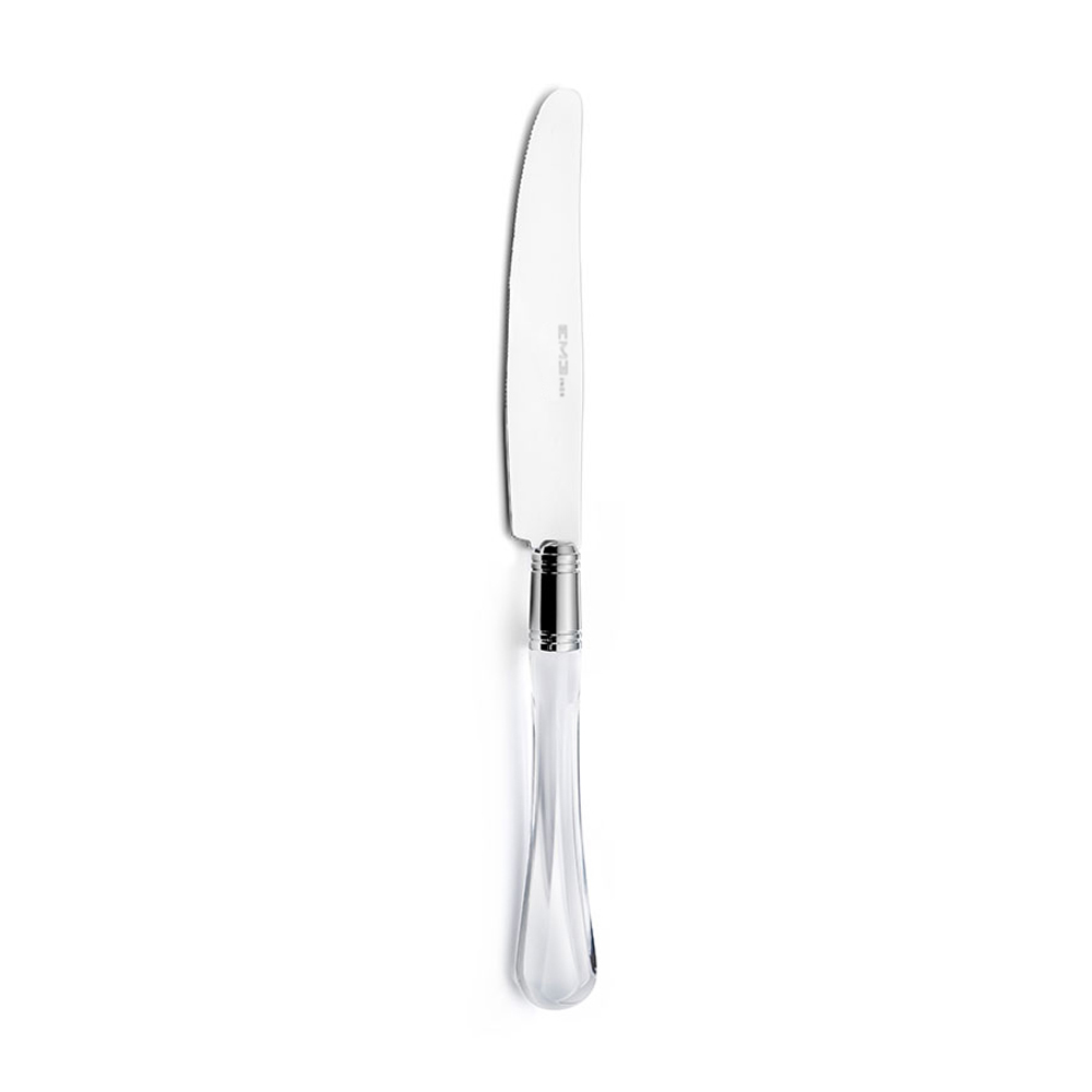 The collection is characterized by the transparent and faceted acrylic methacrylate handle that evokes the cut and the play of light of precious stones. The chromed ring plays a double role: it not only hides the steel graft in the transparent handle, but also makes the cutlery as important as a real jewel.