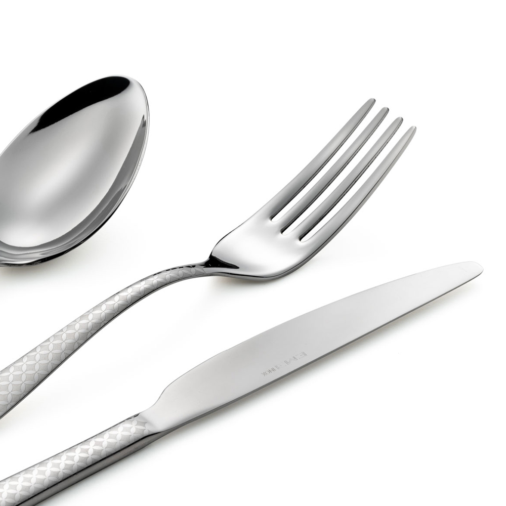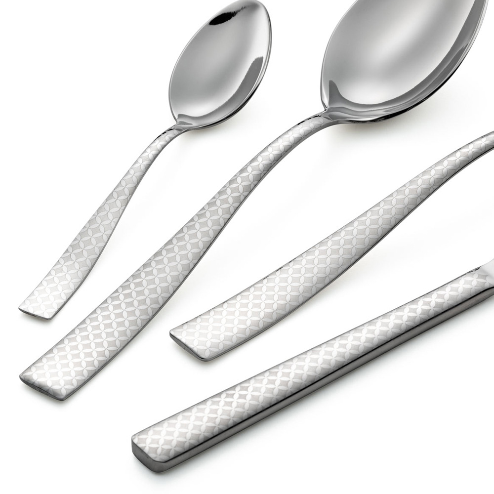 Minimal design stainless steel cutlery set with geometric laser decoration, 24 pieces made in Italy.