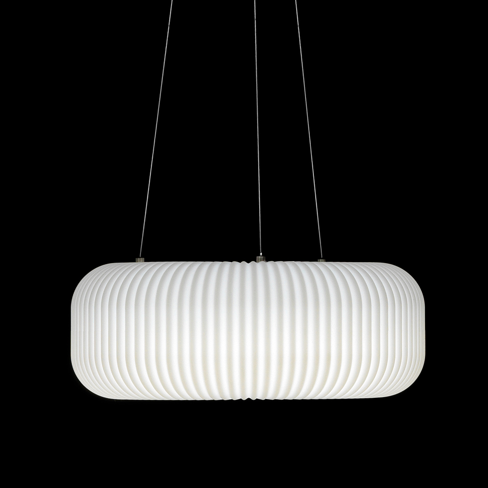 This lamp stands out for its elegant and minimalist design, which combines thin metal cables with an organically shaped plastic diffuser. The plastic, worked with pleated details, adds a touch of visual refinement and helps to diffuse the light softly and evenly, creating a welcoming and relaxing atmosphere.
