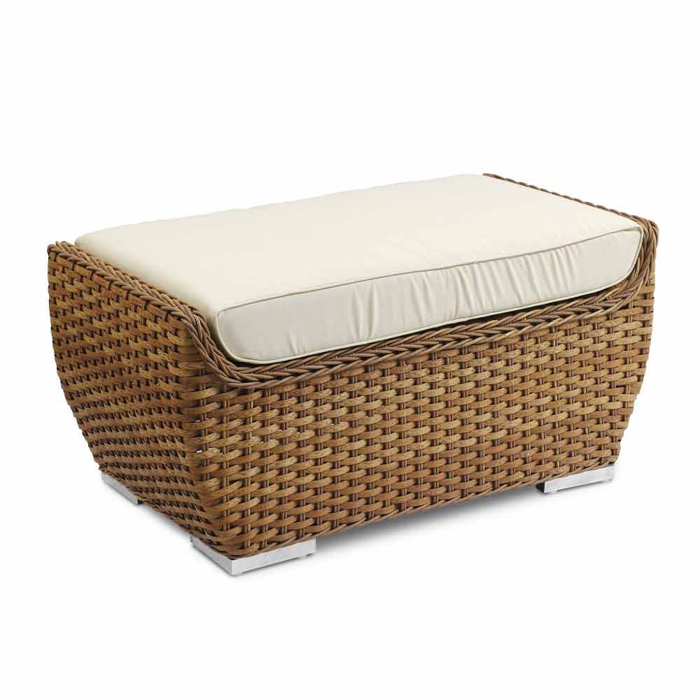 Pouf for the garden made of fine luxury woven synthetic rattan and white or ecru cushion.