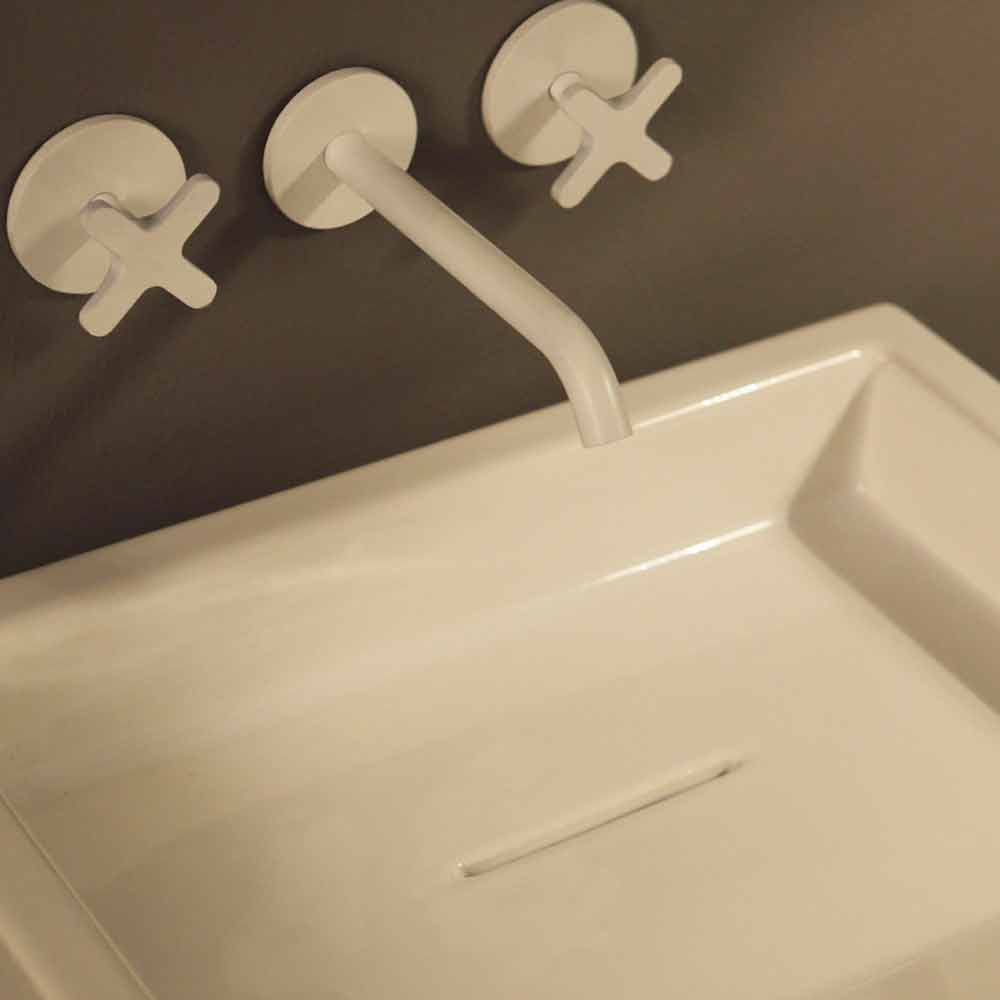 Modern rectangular design washbasin inspired by the old public fountains with continuous water drain.