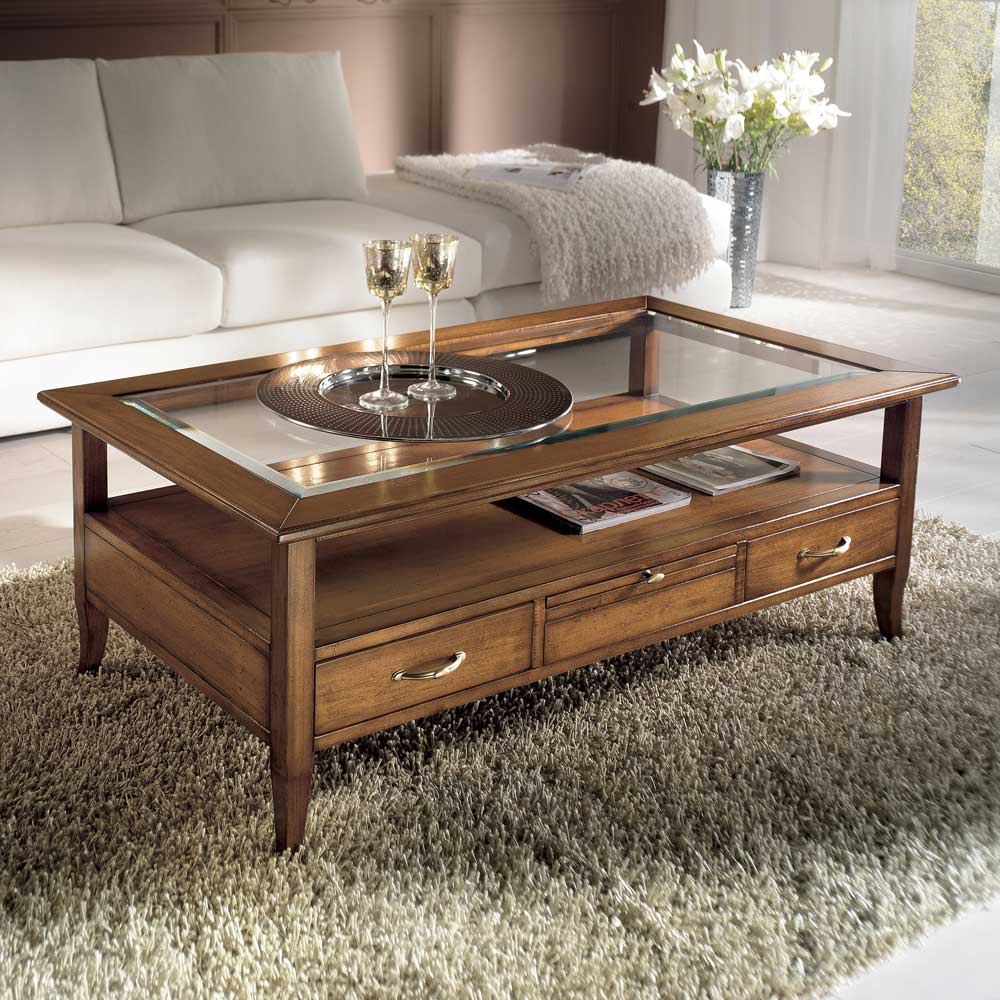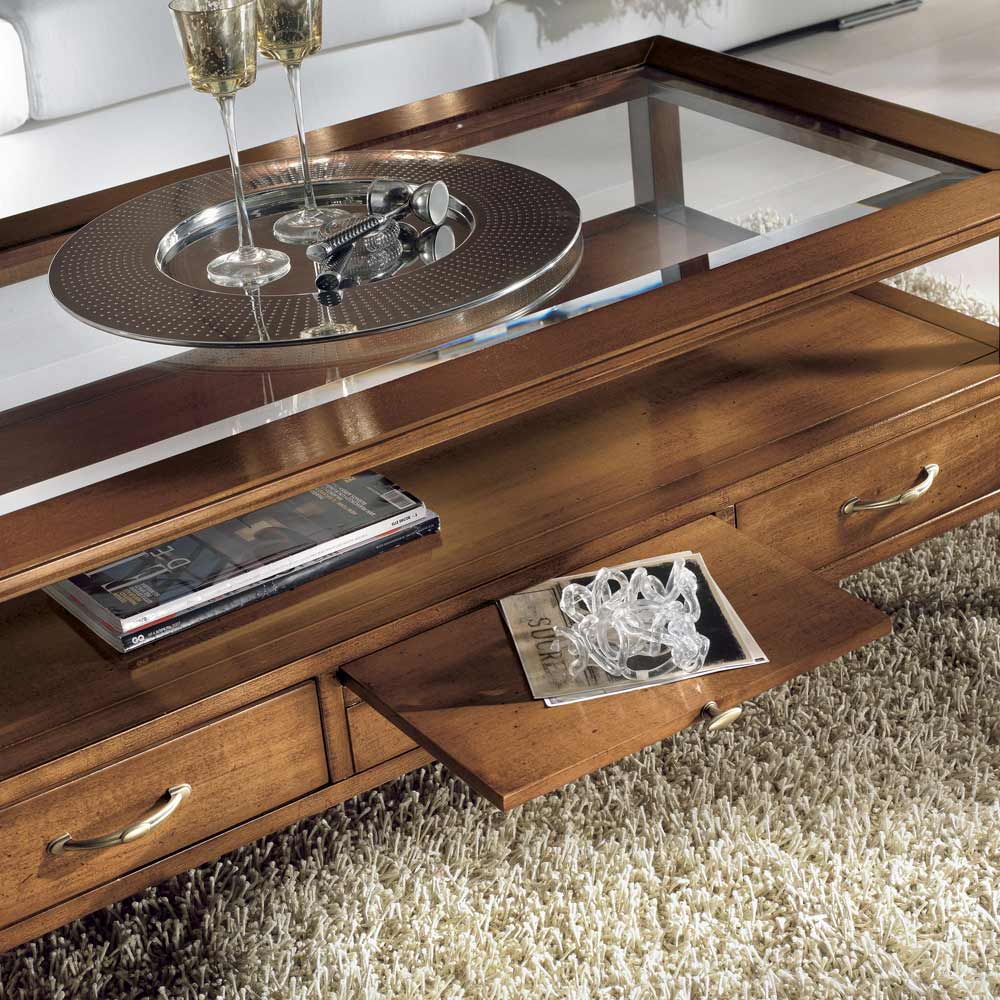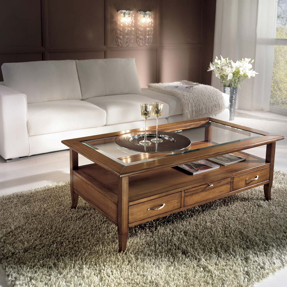Indoor coffee table with wooden structure and glass top with 4 drawers and 2 pullers entirely Made in Italy.