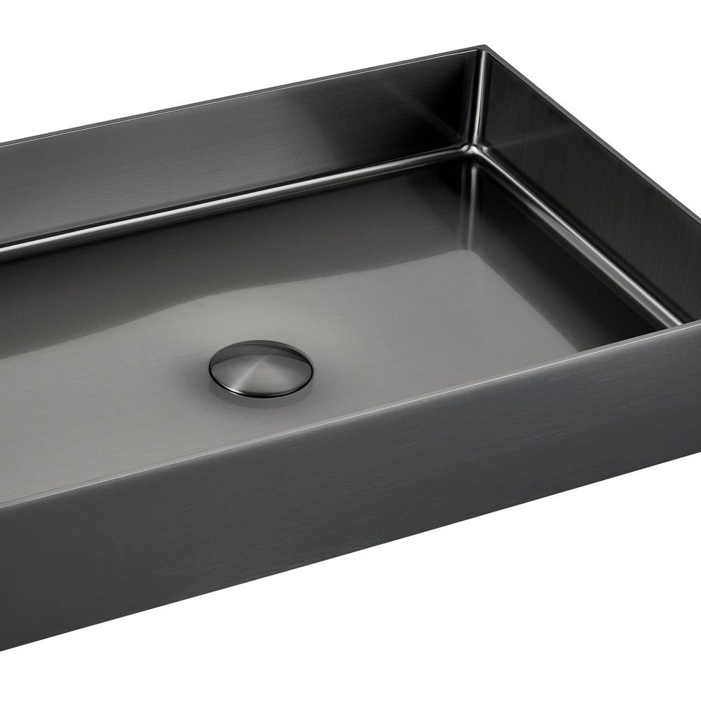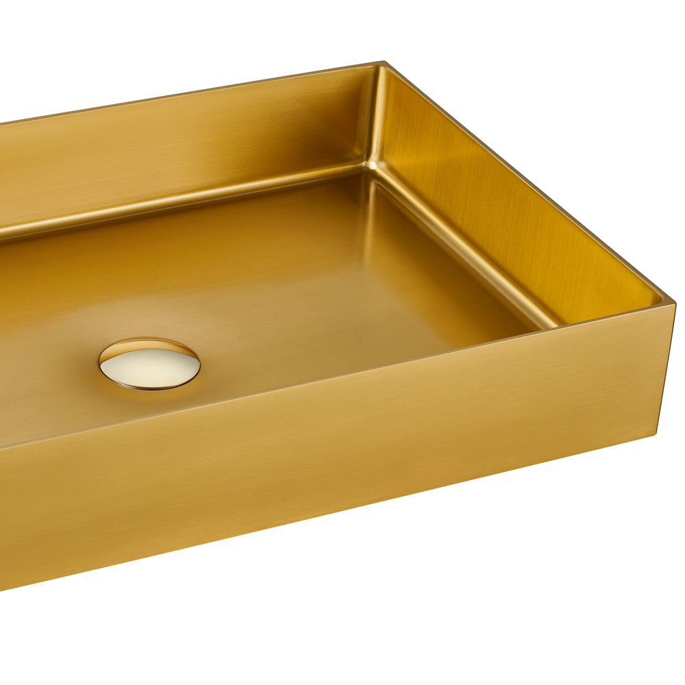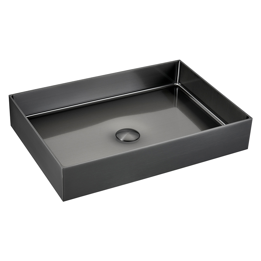 The rectangular countertop sink in 3 mm SUS 304 stainless steel is a jewel of design and functionality. Manufactured from a single sheet of metal, it offers a clean, modern aesthetic. The PVD+Nano coating finishing treatment, combined with meticulous brushing, gives an attractive and almost enigmatic appearance to the object, enhancing the shine and resistance to stains and scratches. The design is characterized by balanced shapes and ideal proportions, available in three finishes that elegantly adapt to any environment. Furthermore, refined details such as the coordinated drain cover included and the total absence of visible welding elevate this sink to a true masterpiece of craftsmanship and design, making it a standout piece for bathrooms with a luxurious and contemporary flavour.
