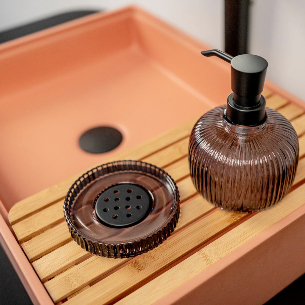 The rectangular countertop terrazzo sink features a vibrant Mali orange finish, making a true style statement in the world of interior design. Not only is it an ethnochic and pop style statement, but it also offers practicality with its spacious tub . The removable bamboo top is an ingenious gem, perfect for keeping accessories and cosmetics close at hand. This piece is ideal for adding a touch of color and personality to any contemporary bathroom, pairing perfectly with the most popular wall coverings. An object that does not go unnoticed, ready to become the visual fulcrum of your bathroom space.