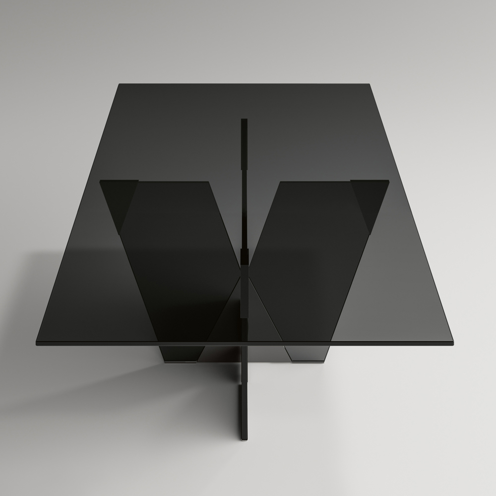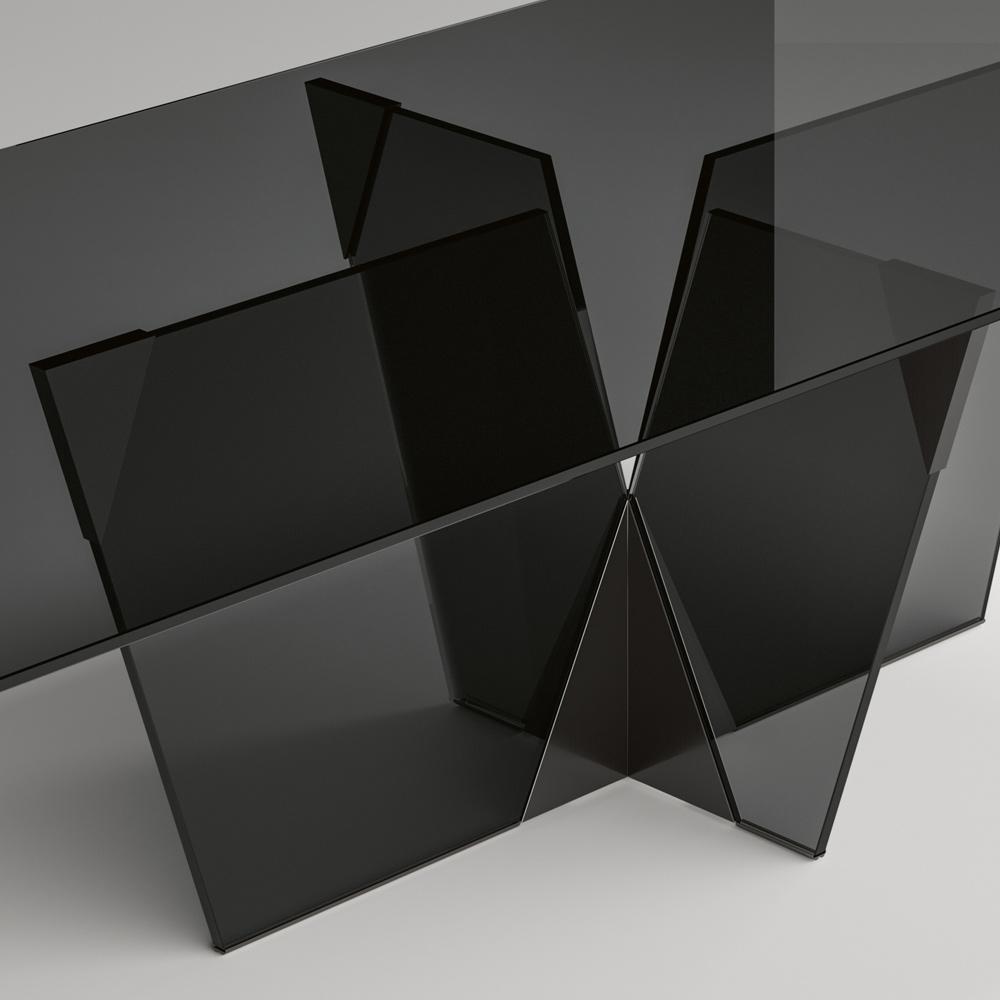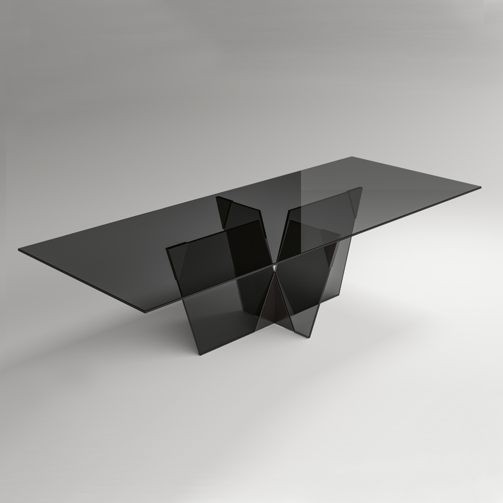 Dining table with rectangular top and glass base made entirely in Italy . Characterized by an elegant and sculptural structure , this piece of furniture is born from the combination of materials of different nature together with the passion for glass processing, thus managing to define a representation of strength and character through different shapes and thicknesses. The strong point of its aesthetics is the architectural base characterized by a pyramidal joint made of metal which constitutes the essential part of the product. The metal elements complete the design of the table giving shape to the glass of the base and enriching it with personality and originality.