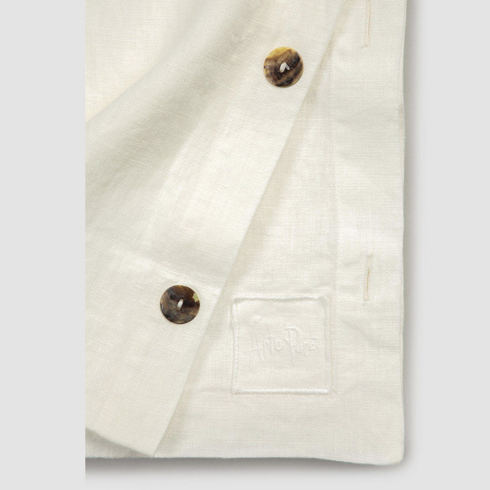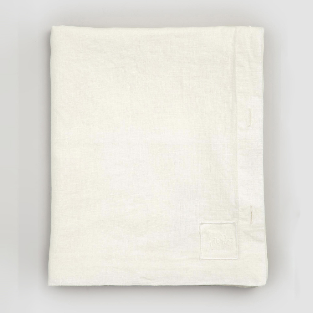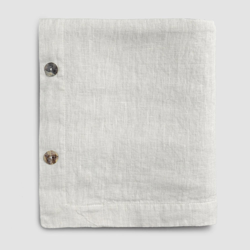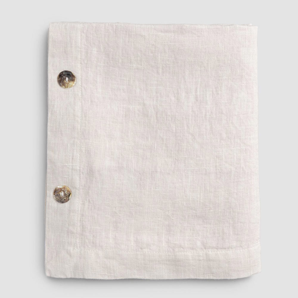 The value of tradition joins the modern lifestyle with this heavy linen tablecloth embellished with a series of agoya mother- of-pearl buttons on one long side.