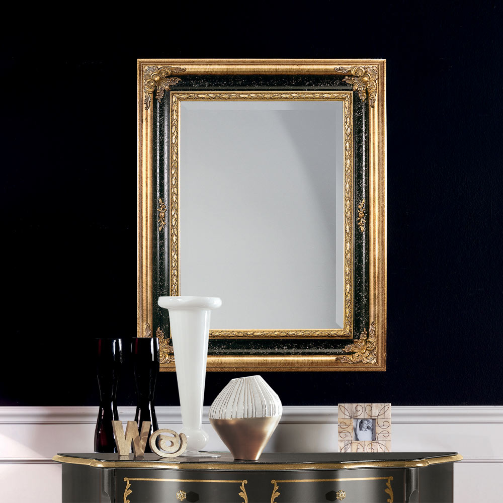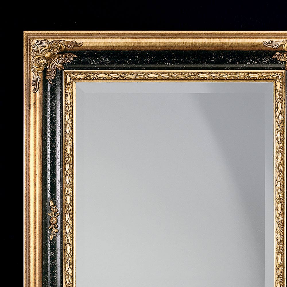 Elegant rectangular mirror with wooden frame decorated with gold leaf and black lacquer. Ā Thanks to its classic style , this mirror is ideal for giving any room an elegant and luxurious touch.