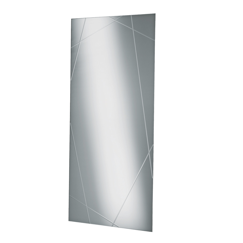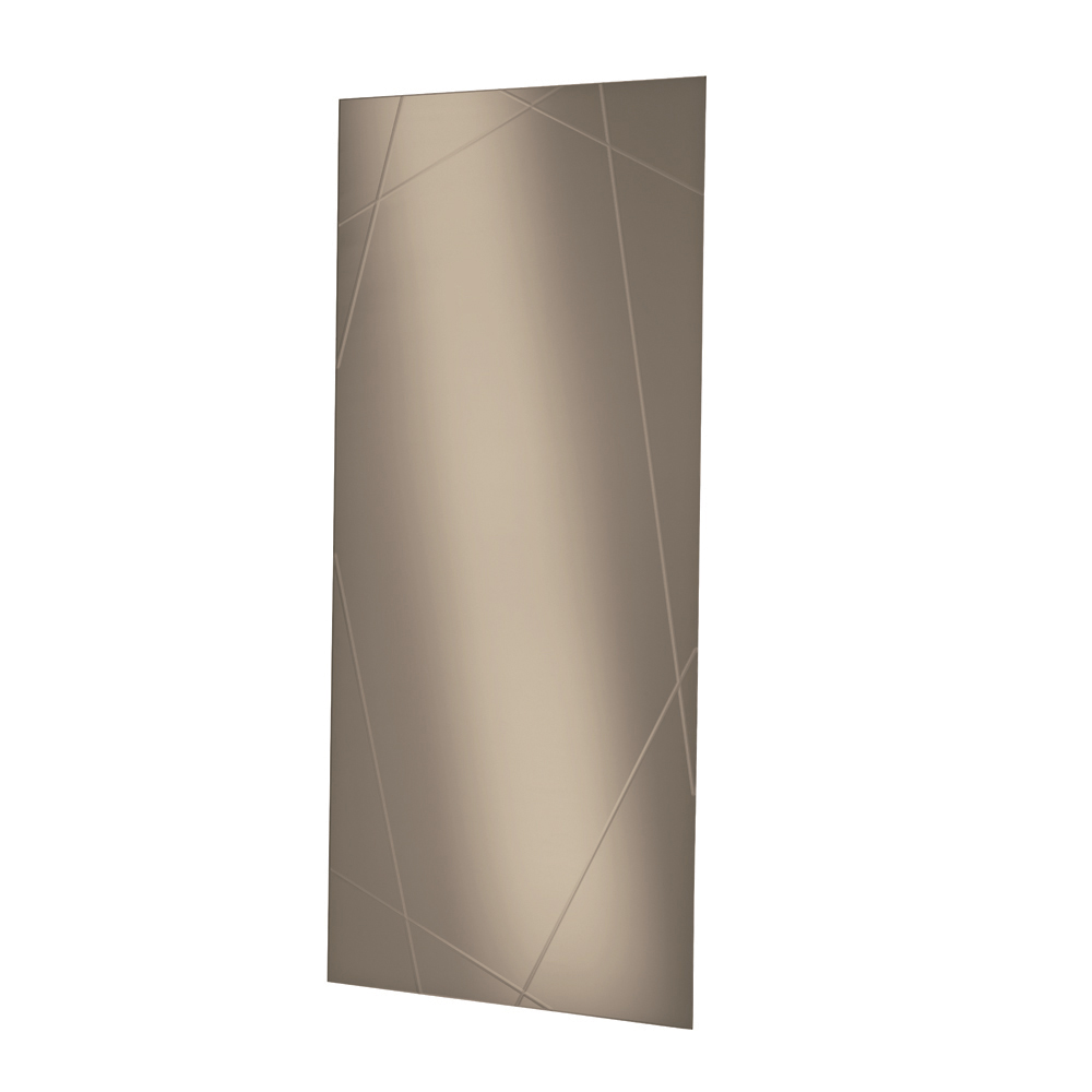 The mirror has a rectangular shape, a thickness of 4 mm , and features laser-cut engravings that create an elegant geometric pattern on the surface. This decorative detail creates a refined play of light and reflections, giving the mirror depth and personality.