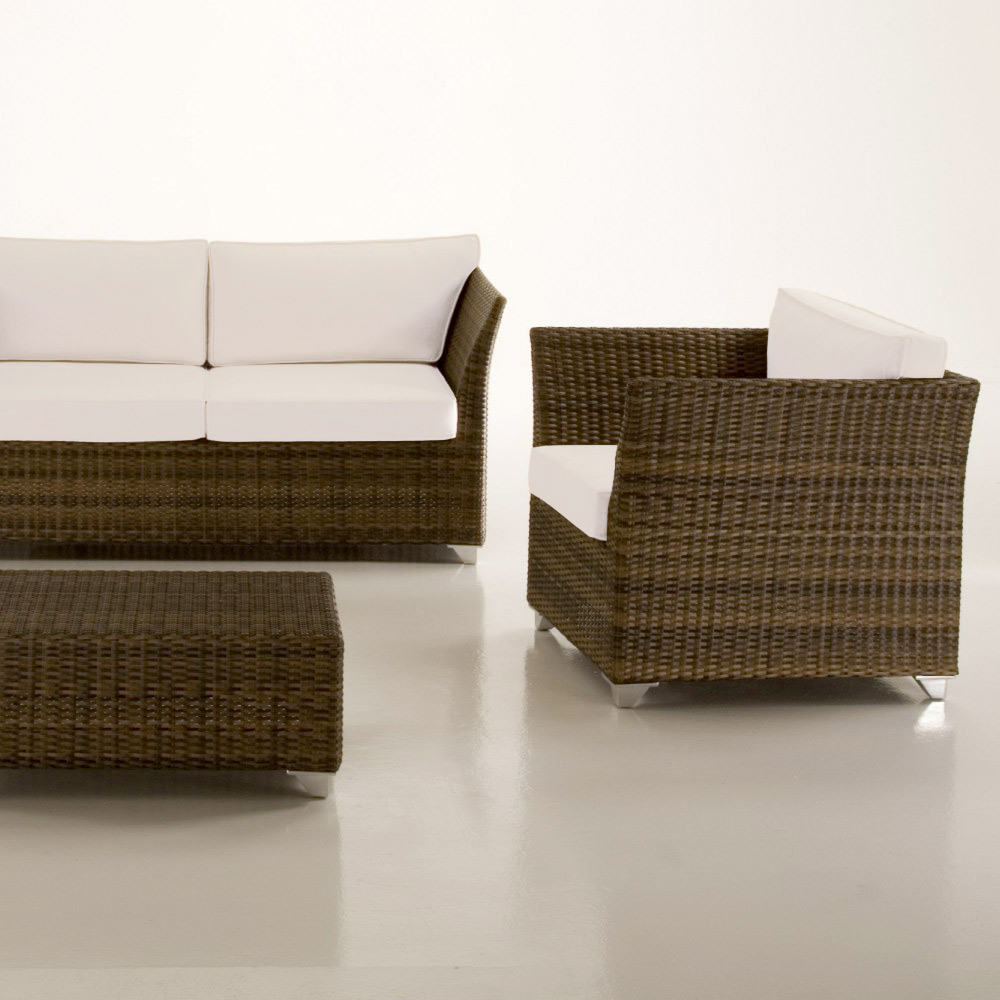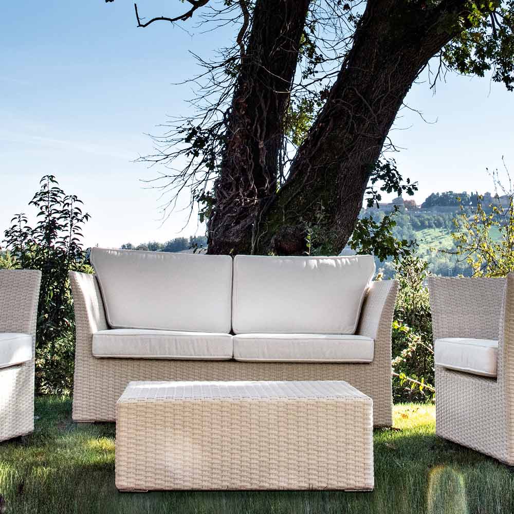 The poly rattan frame adds a touch of resistance and durability against the elements, maintaining its beauty over time. The matching coffee table is the ideal complement to host drinks and snacks, making it the perfect set for your guests and for your outdoor evenings.