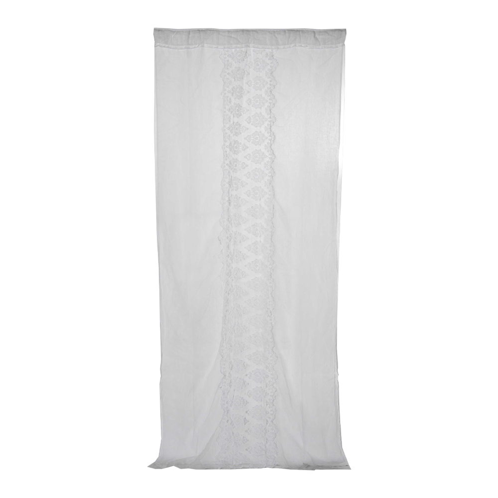 The value of tradition joins the modern lifestyle with this natural white light linen curtain with organza and vertical Gothic embroidery in the central part and predisposition for a cane in the upper part with organza decoration.