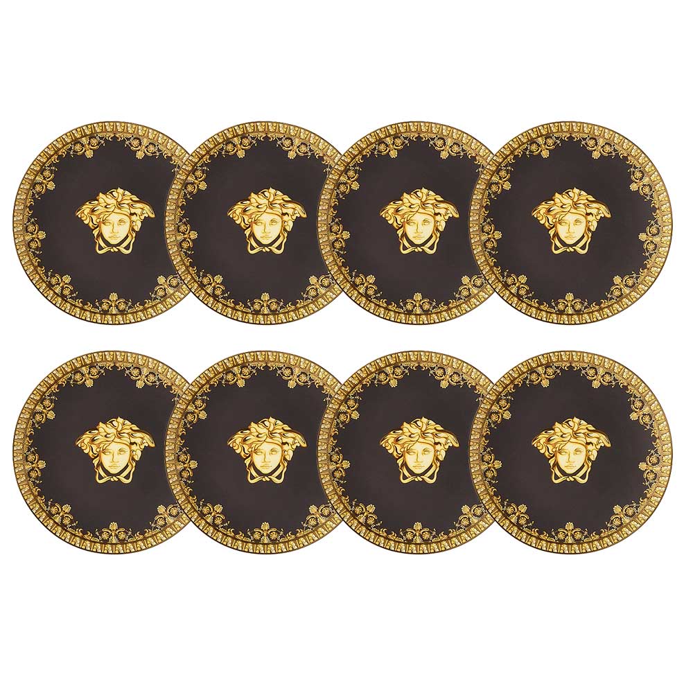 The I Love Baroque plate by Versace , made of fine porcelain , is the essence of refinement and timeless luxury . The sophisticated design features a deep black background, enriched by a border decorated with golden baroque motifs that embody the artistic tradition of the maison. In the center, the iconic face of Medusa , a symbol of power and eternal charm, dominates, giving a regal and distinctive character to this masterpiece.