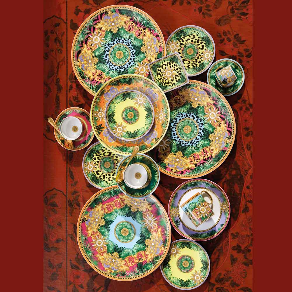 The Jungle Animalier cup by Versace , crafted from fine porcelain , is an explosion of style and wild luxury . Its eye-catching design combines a vibrant animalier motif on a yellow background, framed by lush tropical leaves and dominated by the iconic Medusa symbol, set in a golden sun and embellished with baroque details.