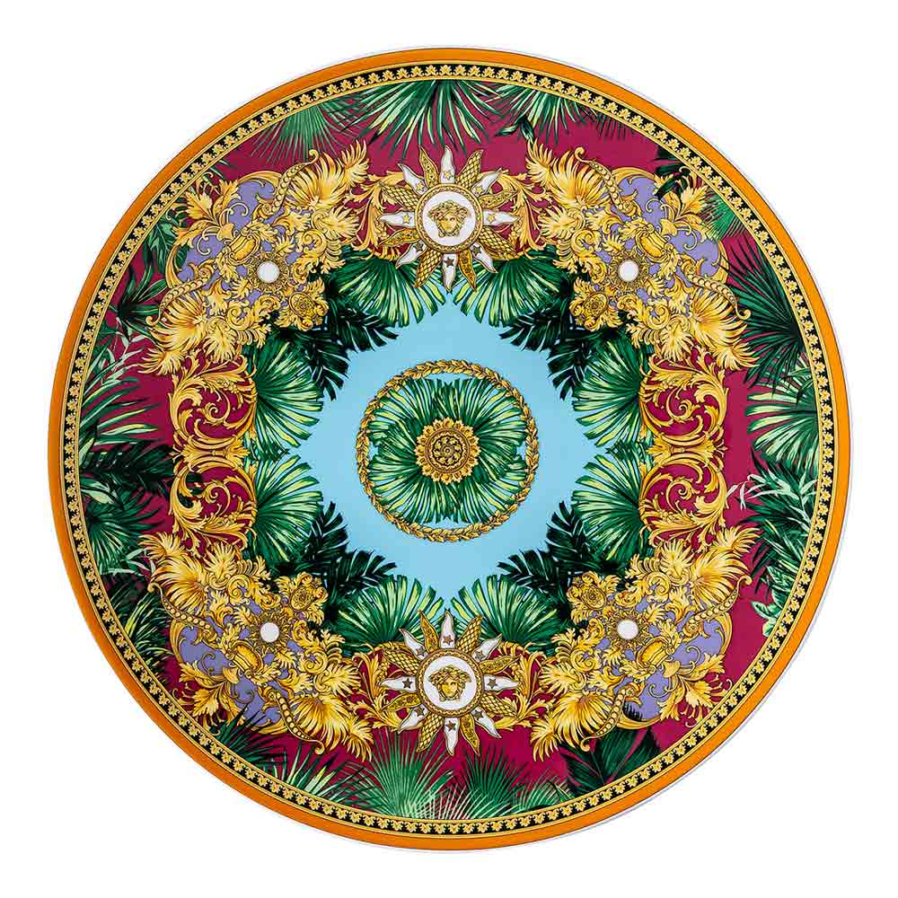 The Jungle Animalier placemat by Versace , in fine porcelain , is a celebration of exoticism and luxury . The extraordinary design combines a mix of tropical motifs , with lush leaves, golden baroque elements and the unmistakable symbol of the Medusa , set in a shining sun. The bright colors, ranging from deep green to turquoise, passing through ruby red details and golden accents, create a vibrant and captivating work of art.