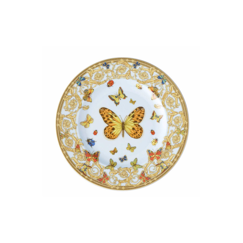 This charming porcelain plate features a bright and colorful design that immediately catches the eye, making it a collector's item as well as a refined tableware. An elegant butterfly stands out in the center, surrounded by a delicate ornamental border with floral and arabesque motifs.