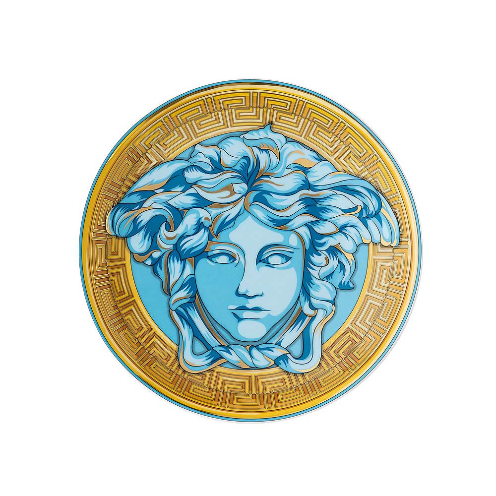 The Versace Medusa Amplified Bread Plates , crafted from precious porcelain , embody a perfect balance between art and contemporary luxury . The bold design highlights the legendary face of the Medusa , the iconic symbol of the house, surrounded by a vibrant golden Greek motif and delicate shades that give a modern and refined touch.