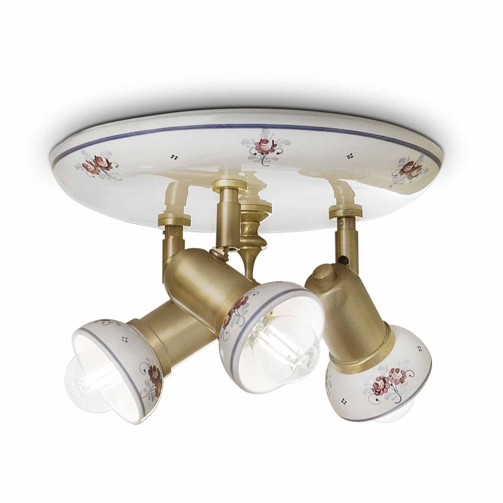Round 3-light ceiling lamp in brass and hand-painted ceramic, made in Italy by Ferroluce.