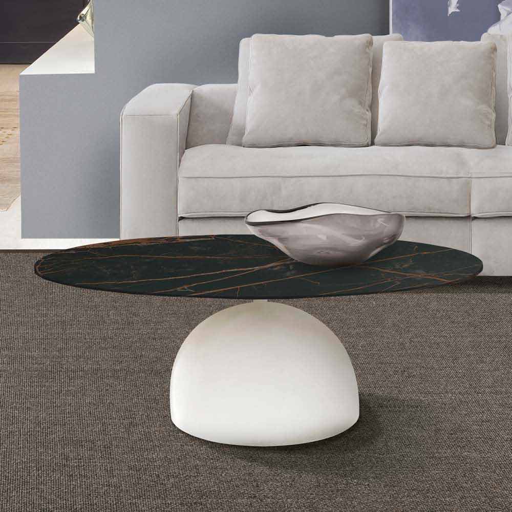Coffee table entirely made in Italy with ceramic top and white painted metal base. A design marked by simple and essential lines but enriched by the precious details that complete the ceramic top, an elegant and refined material that gives the product its strong modern personality . A creative furnishing idea that plays with different finishes and textures for an exclusive result that can fill the center of your living area, attracting every attention thanks also to all the quality and value of true Made in Italy which underlines its high value. Rounded and sinuous shapes that offer us the possibility of fully grasping the beauty of every moment experienced within our living room.