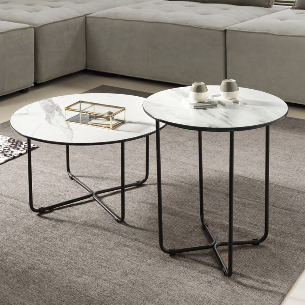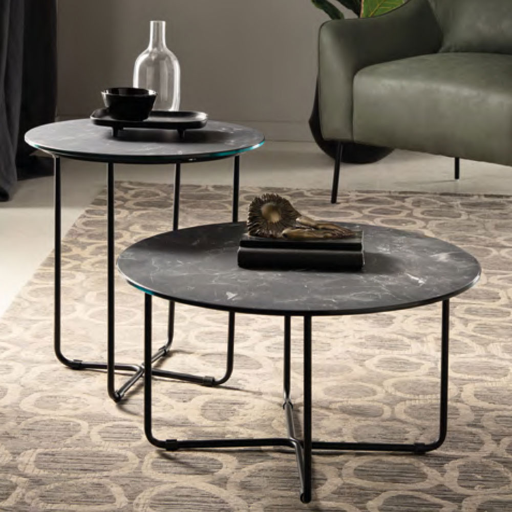 Coffee table with round glass top with marble effect Made in Italy.